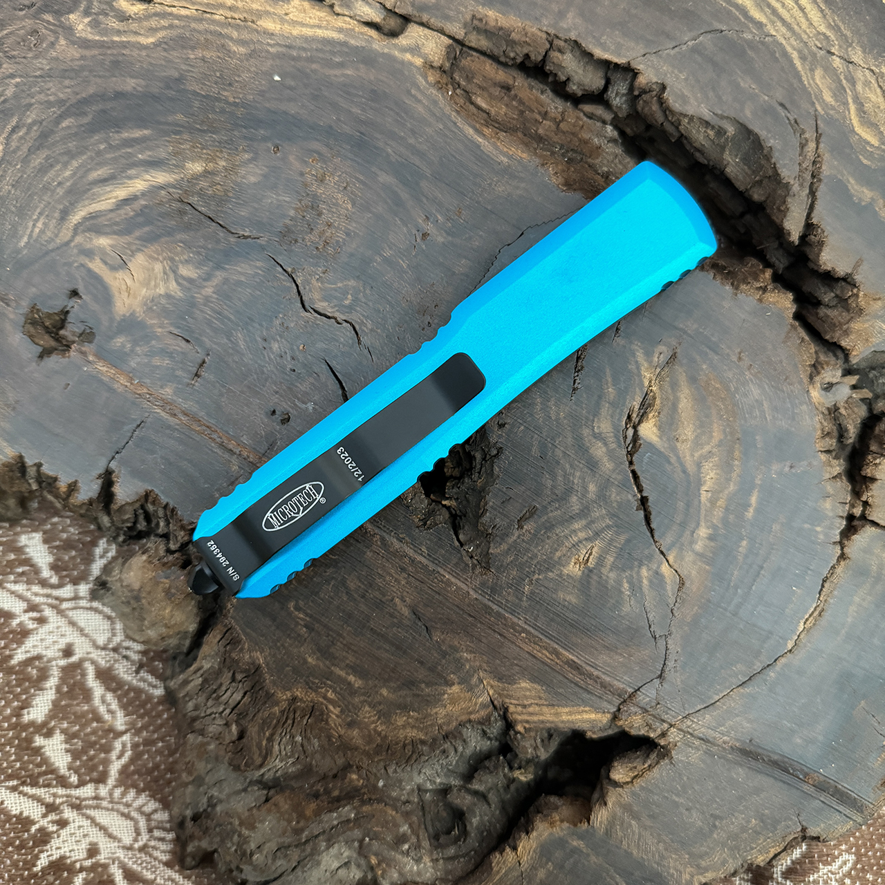 This model features turquoise anodized 6061-T6 contoured aluminum handle scales with the Claw logo on the front. Black finished M390 stainless steel single edge drop point blade with a partially serrated cutting edge. All black hardware. Reversible pocket clip, lanyard hole, and glass breaker. The clip features the Microtech logo, serial number, and production date. The blade has the Microtech logo and model information. Brand new in box.