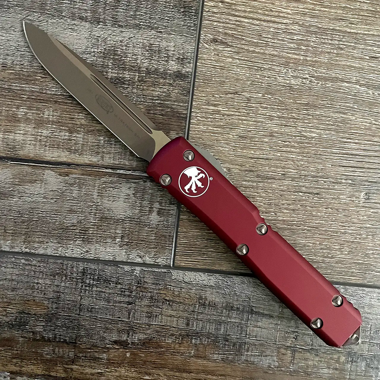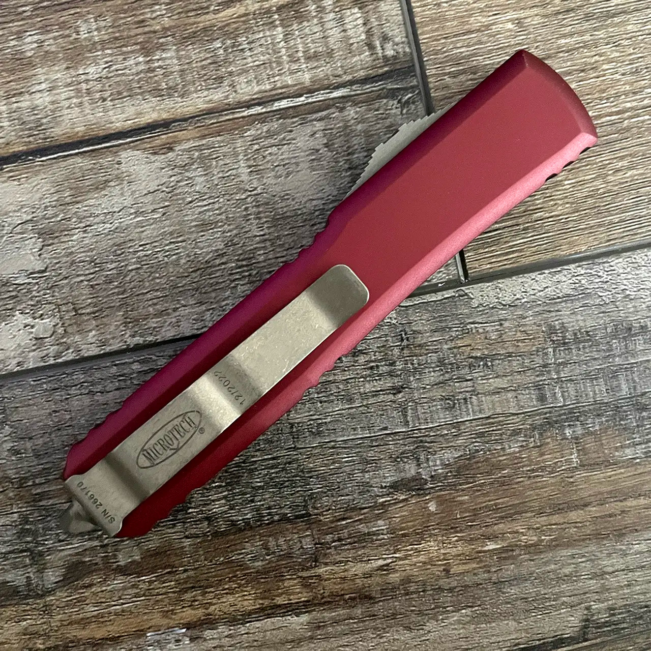 This model features merlot anodized 6061-T6 contoured aluminum handle scales. Bronzed apocalyptic finished M390 stainless steel single edge drop point blade. Bronzed apocalyptic finished hardware, pocket clip, and glass breaker. The pocket clip is marked with the Microtech logo, serial number, and production date. The blade is marked with Microtech logo and model information. Brand new in box.