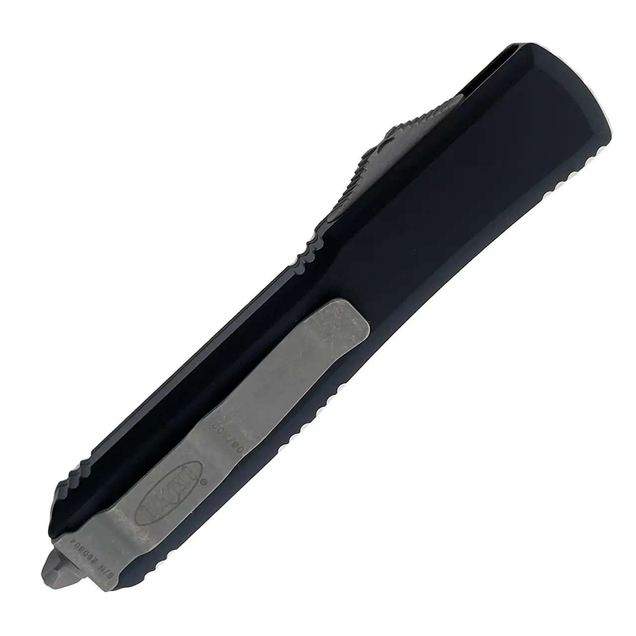 This moedel features black anodized 6061-T6 aluminum handles. Apocalyptic finished M390 stainless steel tanto edge blade with a serrated cutting edge. Apocalyptic finished hardware, glass breaker tip and pocket clip. Pocket Clip is marked with the serial number, date of manufacture, and Microtech logo. Blade is marked with model information. Brand new in box.