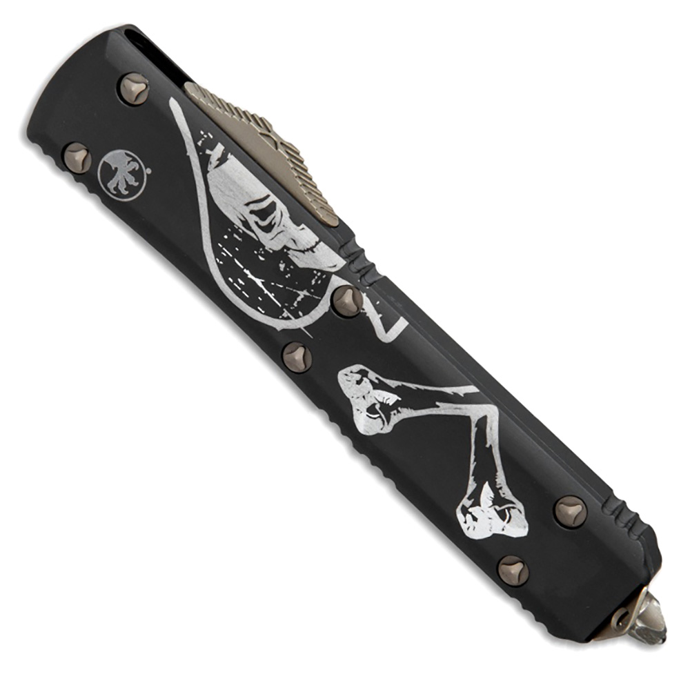 This limited edition Signature Series model features black anodized 6061-T6 contoured aluminum handle scales with the left side of Death Card graphic and the Microtech Claw logo. Bronzed apocalyptic finished M390 stainless steel tanto blade. The blade is etched "MEMENTO MORI". Bronzed apocalyptic finished hardware, pocket clip, and glass breaker. The pocket clip is marked with the Claw logo, Signature Series logo, serial number, and production date. Brand new in box.