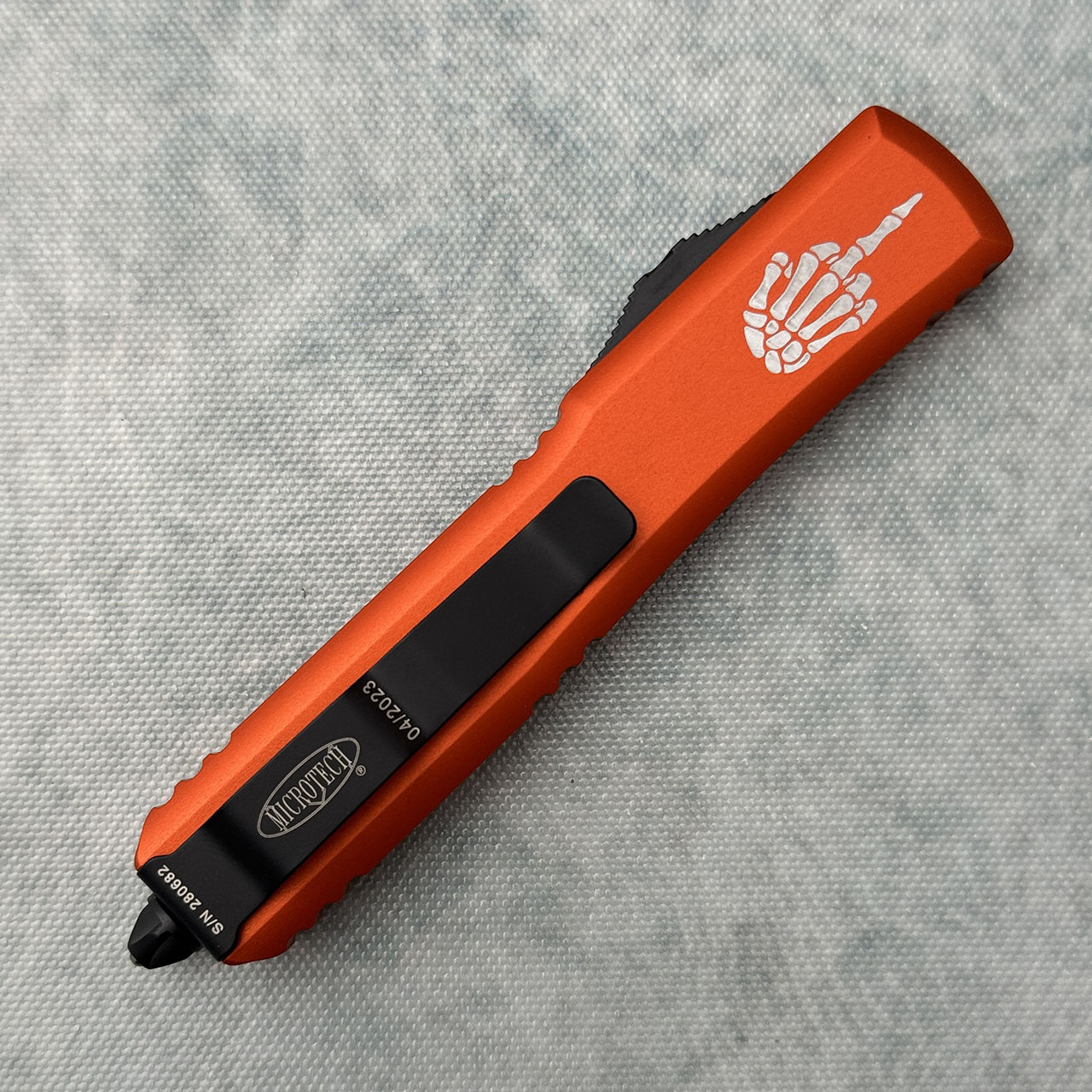 This model features contoured engraved orange anodized 6061-T6 aluminum handle scales with the Claw logo on the front. Black finished M390 stainless steel tanto blade. Black tactical hardware, pocket clip, and glass breaker. The clip features the Microtech logo, serial number, and production date. The blade has the model information. Brand new in box.