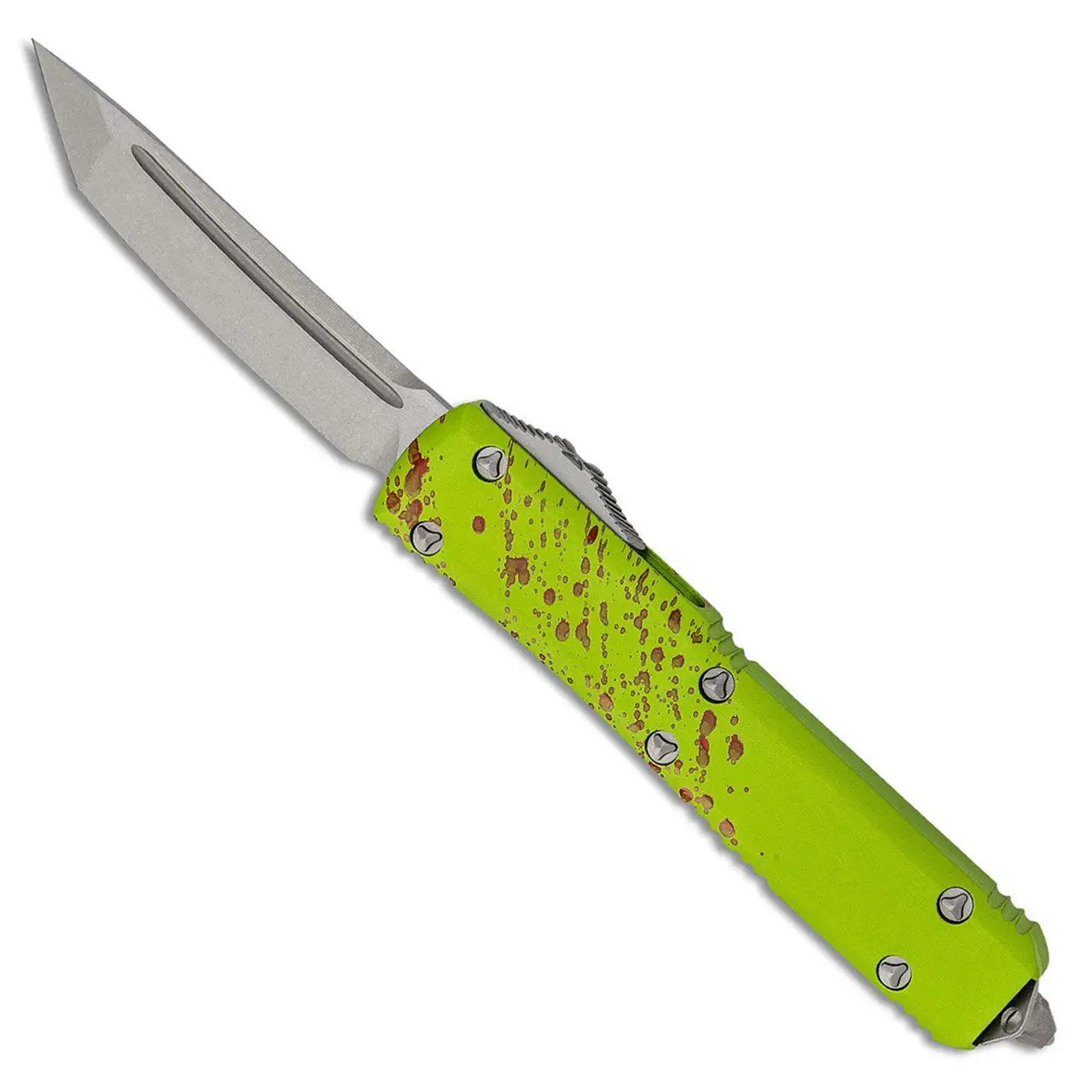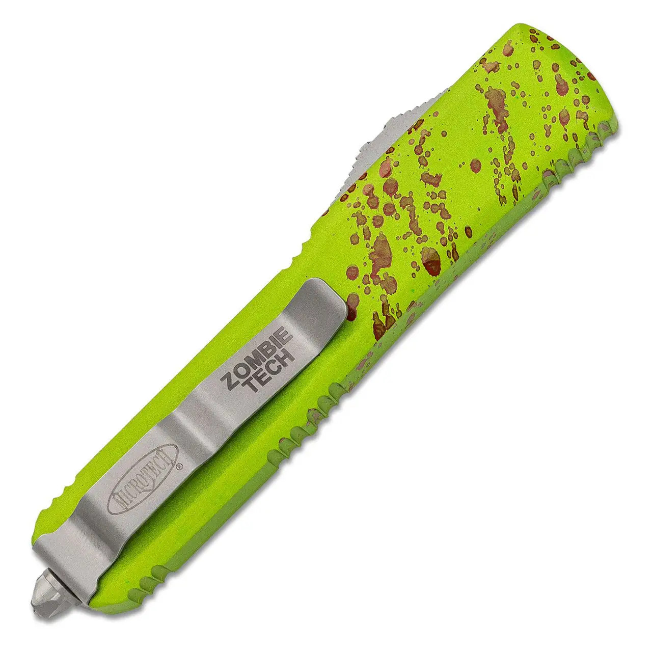 This model features zombie green anodized 6061-T6 contoured aluminum handle scales with random red "blood" spatter. Stonewash finished M390 stainless steel single edge tanto edge blade. Bead blast finished hardware. Reversible pocket clip, lanyard hole, and glass breaker. The Zombie models are sterile with no markings other than the Microtech logo and Zombie Tech on the pocket clip. Brand new in box.