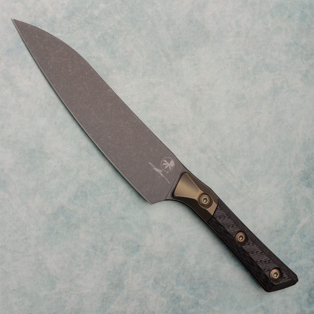 This model has carbon fiber handle scales with a bronzed titanium bolster. DLC finished M390MK stainless steel blade. Brand new in box.