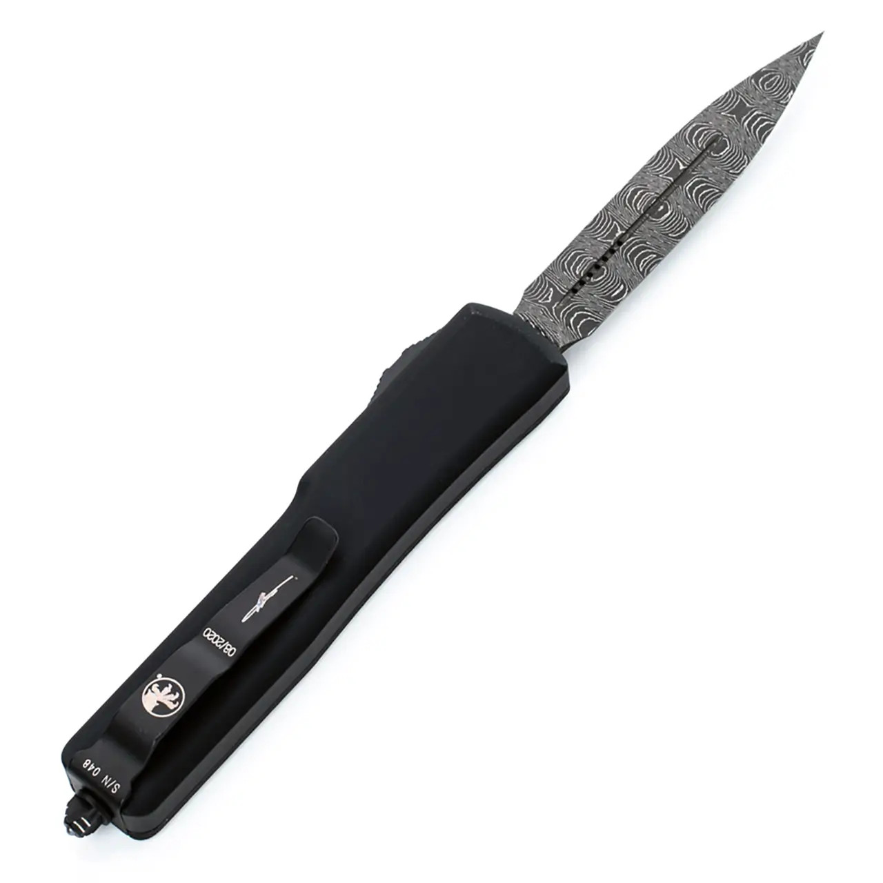 This Signature Series model features a carbon fiber top scale and black anodized 6061-T6 aluminum back scale for the handle. Damascus* double edge dagger blade with standard cutting edges. Ringed black hardware, pocket clip, and glass breaker. The blade has the model information. The pocket clip has the Microtech logo, Signature Series logo, serial number, and production date*. Brand new in box.