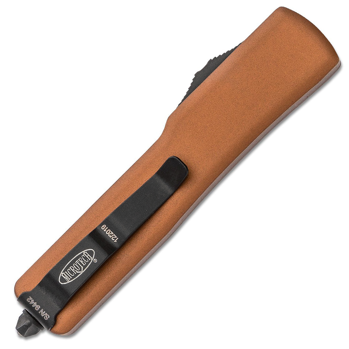 This model features tan anodized 6061-T6 aluminum handle scales with the Microtech Claw logo on the front. Black finished CTS-204P stainless steel single edge drop point blade. The blade has the model information. Black finished hardware, pocket clip, and glass breaker. The pocket clip has the Microtech logo, serial number, and production date. Brand new in box.