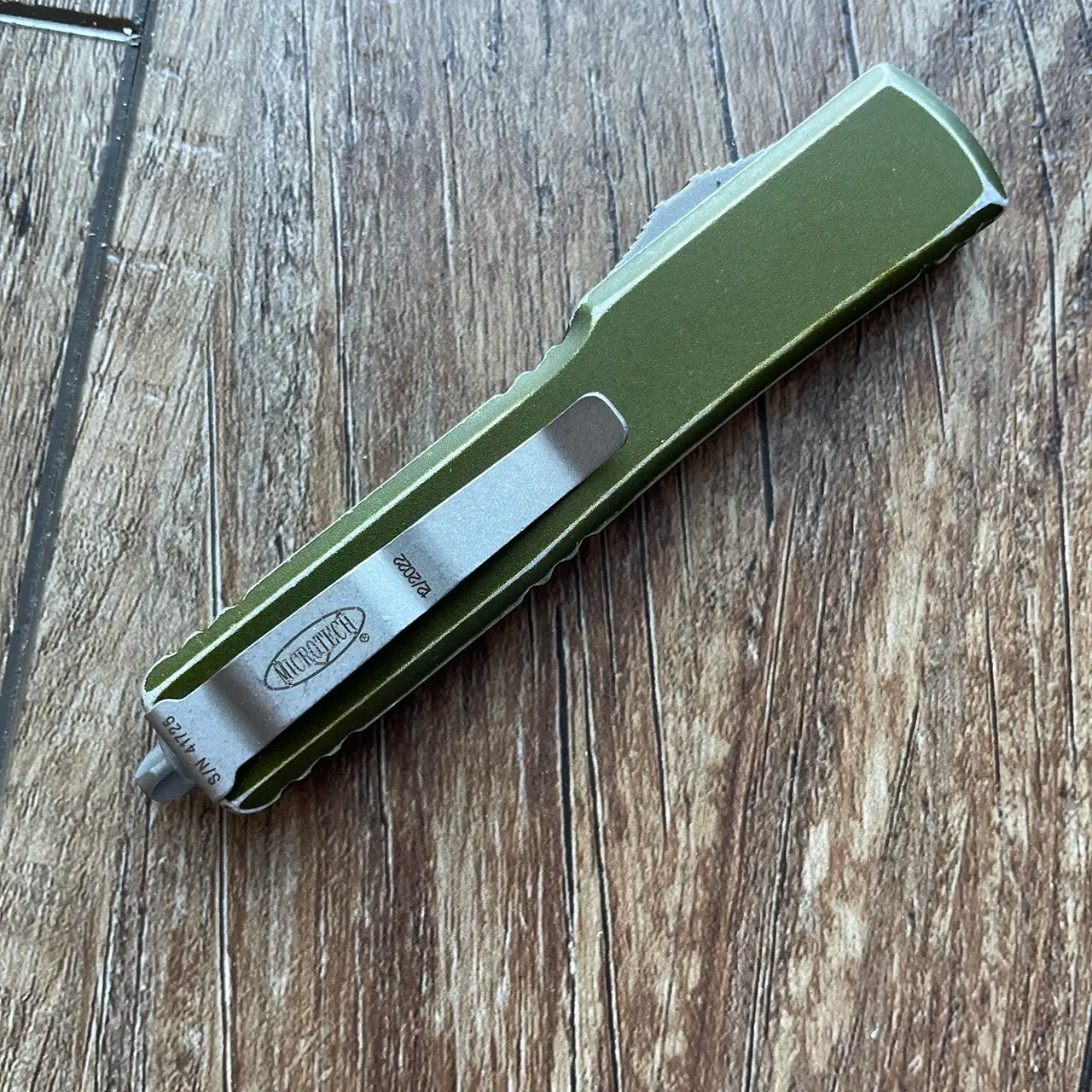 This model features Od Green anodized 6061-T6 aluminum handle scales with the Microtech Claw logo on the front. Apocalyptic finished M390 stainless steel double edge spartan dagger blade. Matching apocalyptic hardware, pocket clip, and glass breaker. The blade has the model information. The pocket clip has the Microtech logo, serial number, and production date. Brand new in box.