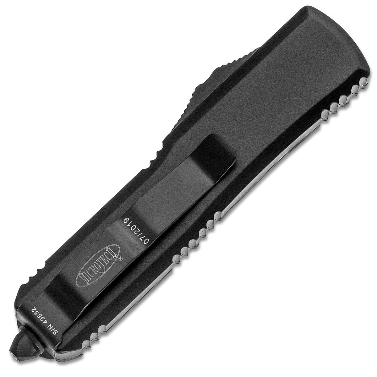 This model features black anodized aluminum handle scales, the front has the Microtech Claw logo. Black finished M390 stainless steel double edge dagger blade. Black tactical finished hardware, pocket clip, and glass breaker tip. The blade has the Microtech logo and model information. The pocket clip has the Microtech logo, serial number, and production date. Brand new in box.