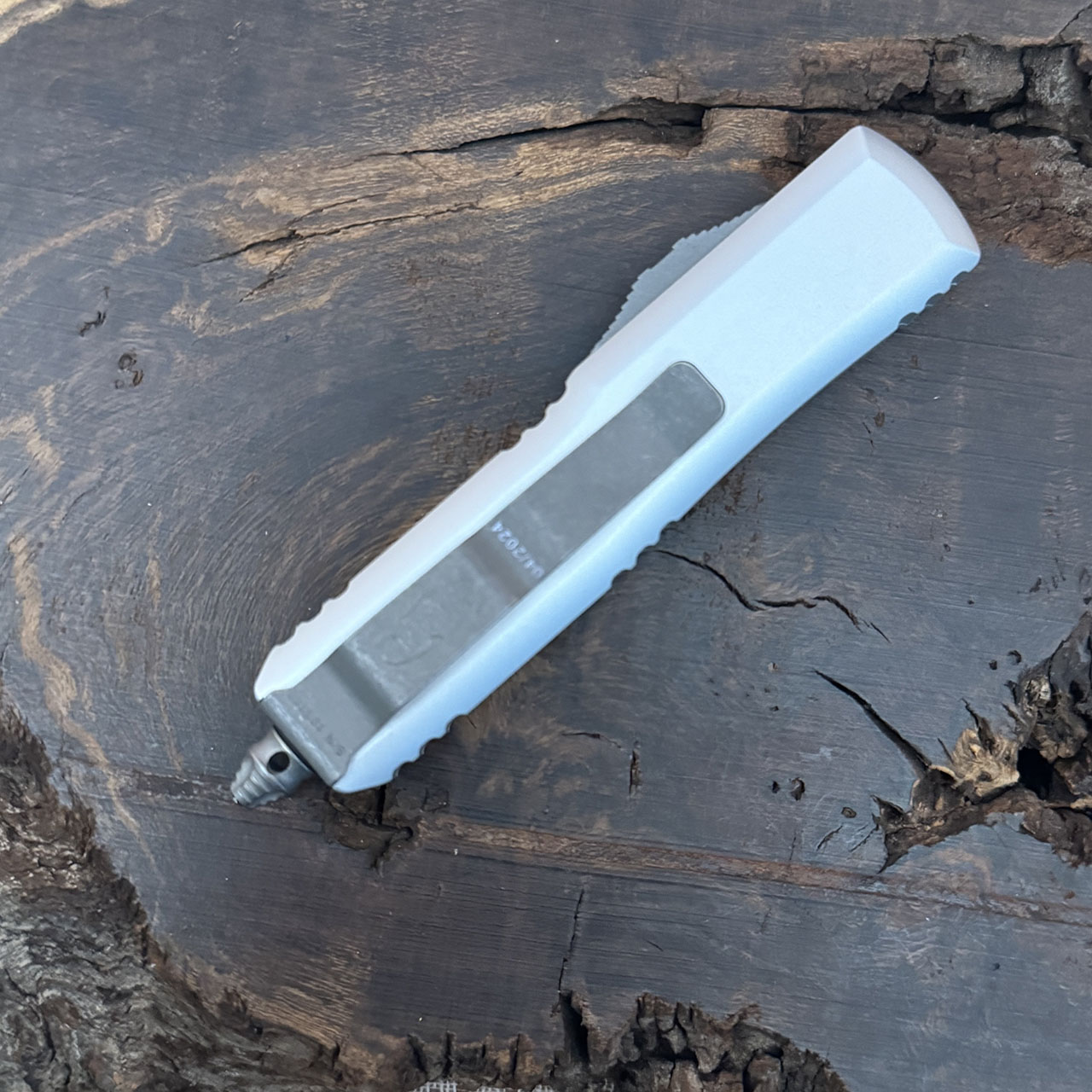 Microtech has updated and refined the UTX-85 model. It features improved ergonomics, with rounded handle faces, and patches of grooves along the sides to ensure excellent grip. The firing button has been redesigned to increase surface contact for effective engagement, and the glass breaker has a ball-tip set in the trip-angle pattern base to increase its everyday carry manners. Based on the Ultratech platform, the UTX-85 is scaled down to 85% of its length. The UTX-85 is an appealing option for those who prefer a smaller EDC knife and value Microtech's high-performance out-the-front action and exceptional build quality.