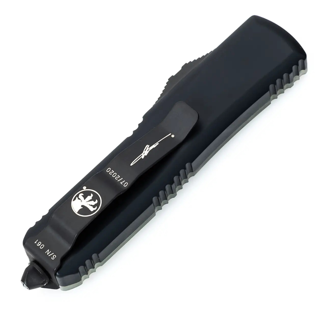 This Signature Series model features a Jade Green G-10 Composite Top and black anodized 6061-T6 aluminum handle scales. Black finished M390 stainless steel double edge blade with standard cutting edges. Black finished hardware, pocket clip, and glass breaker tip. The blade has model information. The pocket clip has the Microtech logo, Signature Series logo, serial number, and production date. Brand new in box.