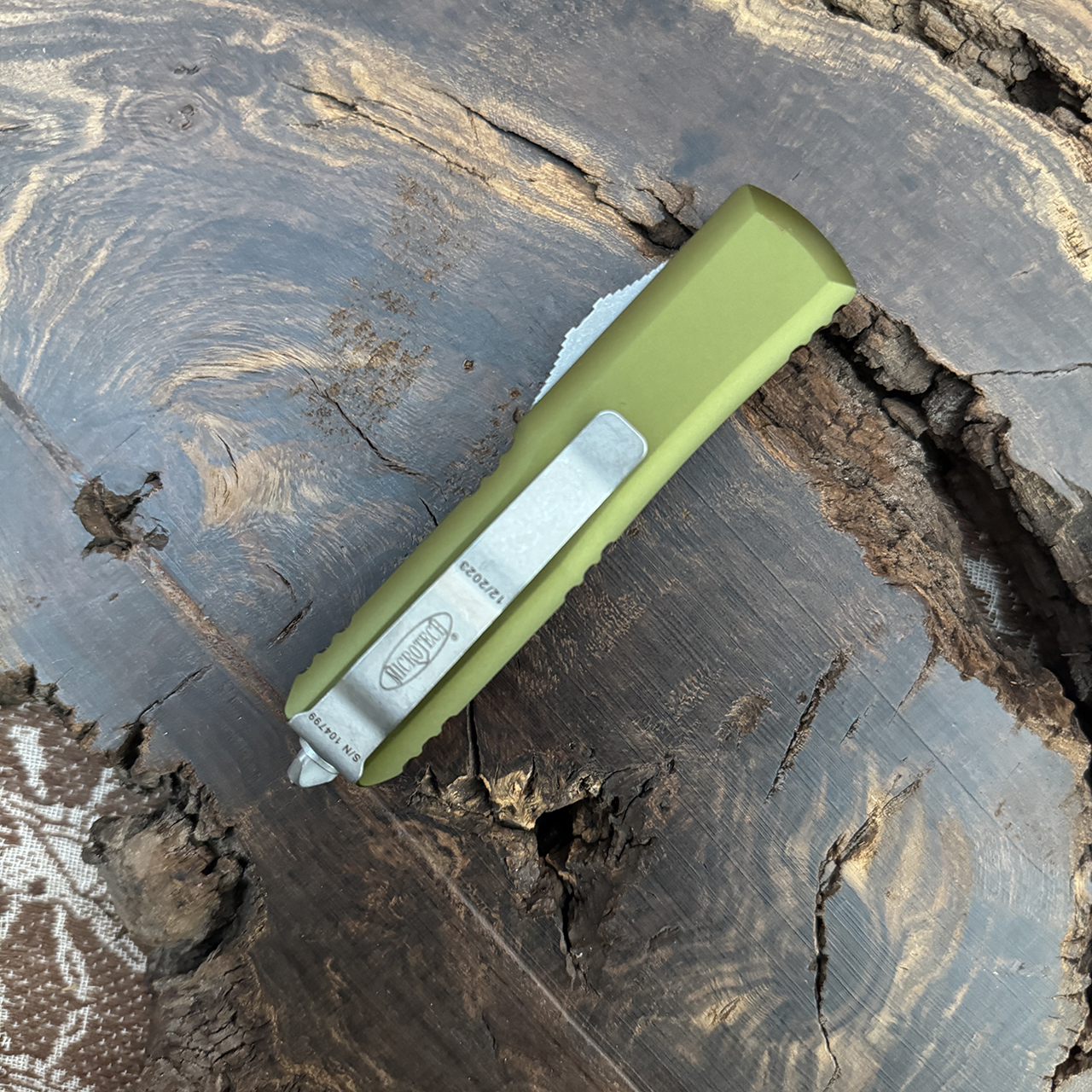 This model features OD Green anodized 6061-T6 aluminum handle scales, the front scale has the Microtech Claw logo. Apocalyptic finished M390 stainless steel double edge dagger blade. Apocalyptic finished hardware, pocket clip, and glass breaker tip. The blade has the model information. The pocket clip has the Microtech logo, serial number, and production date. Brand new in box.