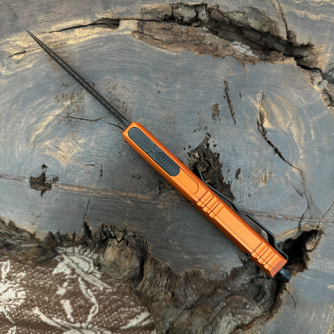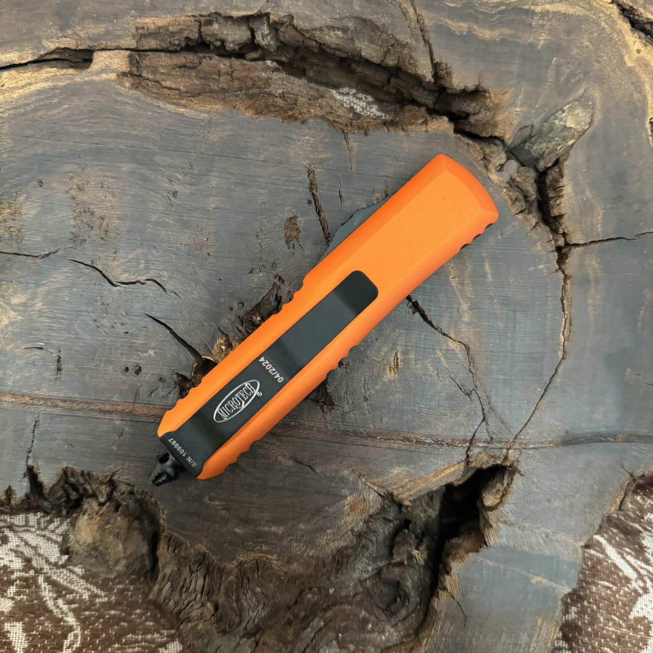 This model features orange anodized 6061-T6 aluminum handle scales. Black finished finished M390 stainless steel double edge blade with one standard cutting edge and one full serrated cutting edge. The blade has model information. The pocket clip has the Microtech logo, Signature Series logo, serial number, and production date. Brand new in box.