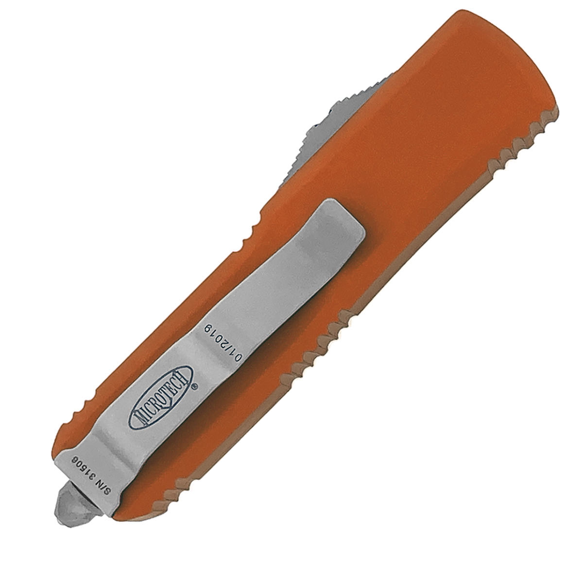 This model features orange anodized 6061-T6 aluminum handle scales, the front scale has the Microtech Claw logo. Satin finished CTS-204P stainless steel double edge dagger blade. Bead blast finished hardware, pocket clip, and glass breaker tip. The blade has the model information. The pocket clip has the Microtech logo, serial number, and production date. Brand new in box.