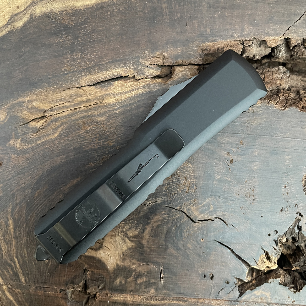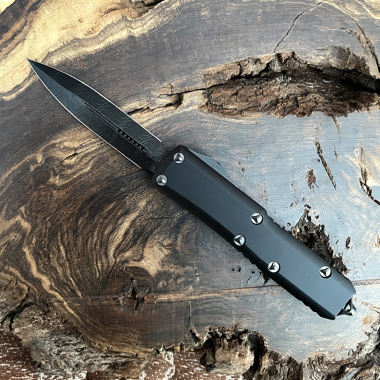 This Signature Series model features black anodized 6061-T6 aluminum handle scales, the front scale has the Microtech Claw logo. DLC finished damascus double edge dagger blade with standrad edge. DLC finished hardware, pocket clip, and glass breaker tip. The pocket clip has the Microtech logo, Signature Series logo, serial number, and production date deep engraved. Brand new in box.