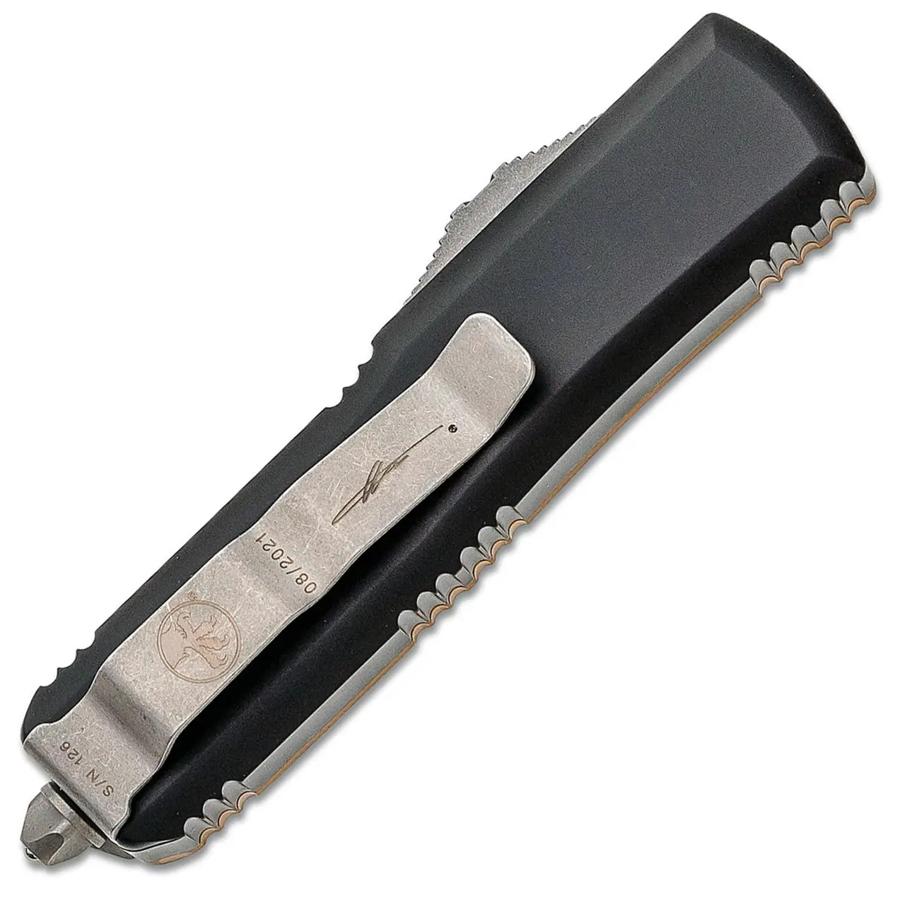 This Signature Series model features a tan G-10 Composite Top and black anodized 6061-T6 aluminum handle scales. Apocalyptic finished M390 stainless steel double edge blade with standard cutting edges. Apocalyptic finished hardware, pocket clip, and glass breaker tip. The blade has model information. The pocket clip has the Microtech logo, Signature Series logo, serial number, and production date. Brand new in box.