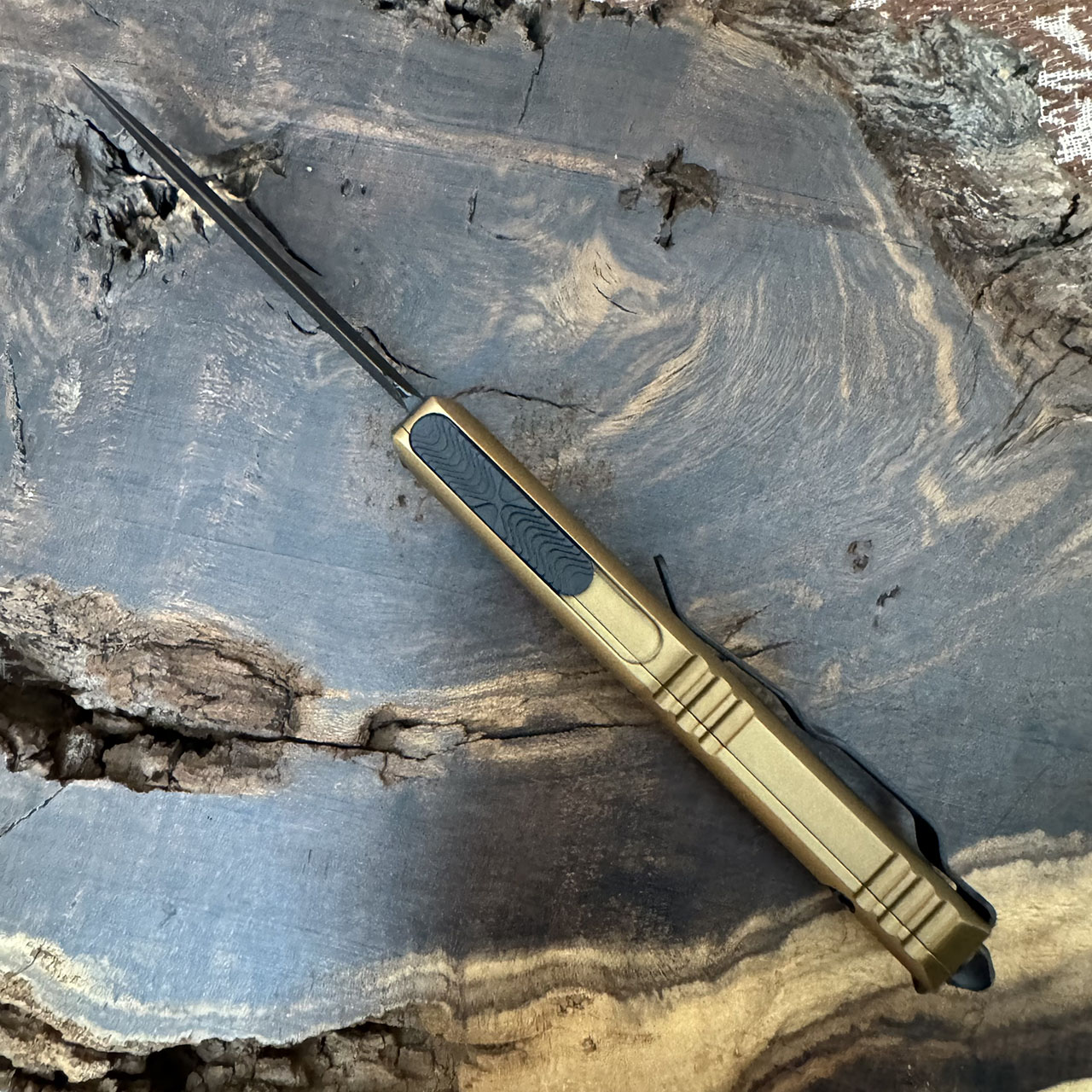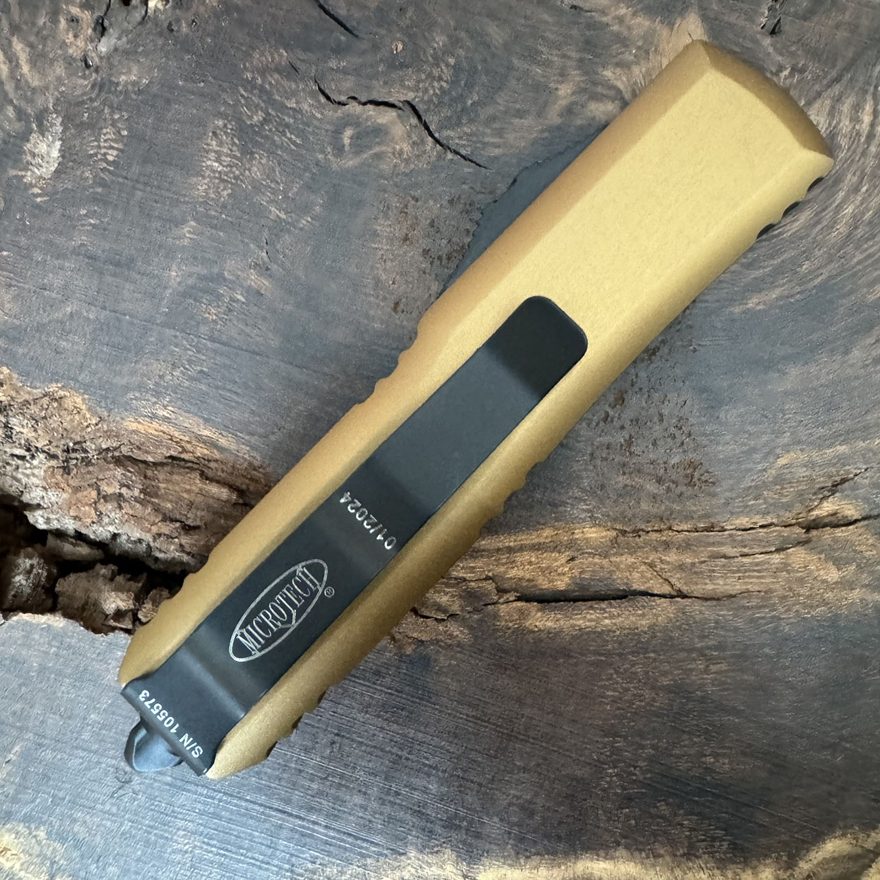 This model features tan anodized aluminum handle scales. Black finished M390 stainless steel double edge dagger blade. Black finished hardware, pocket clip, and glass breaker tip. The pocket clip has the Microtech claw logo, serial number, and production date. Brand new in box.