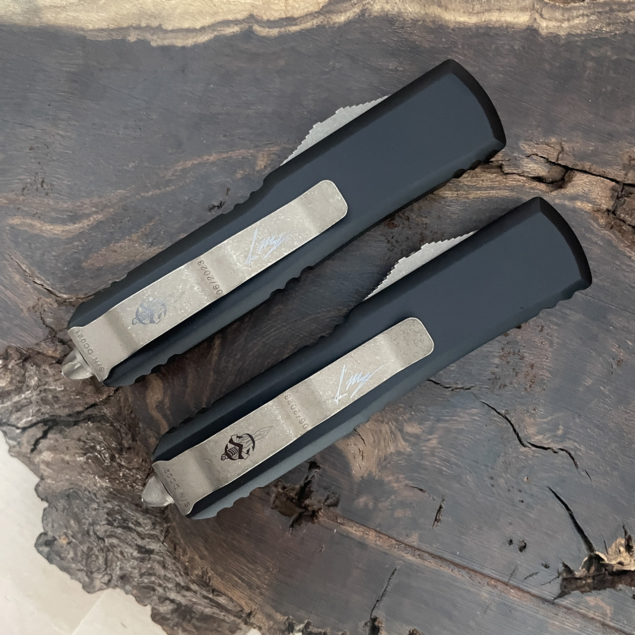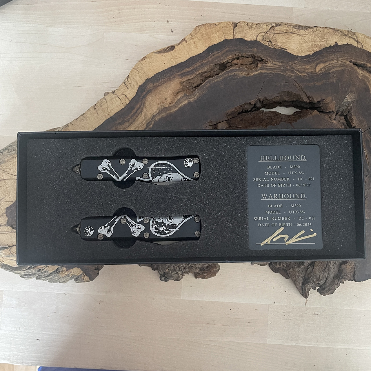 This signature series set features two matching knives with black anodized 6061-T6 contoured aluminum handle scales. Bronzed Apocalyptic finished M390 stainless steel warhound and hellhound blades. Each blade handle features the opposite side of the Death Card graphic. Bronzed apocalyptic finished hardware, pocket clip, and glass breaker. This set features the Signature Series logo and dagger on the pocket clip as well as the production date and serial number. This is a matching serial number set. Brand new in box with COA plate.