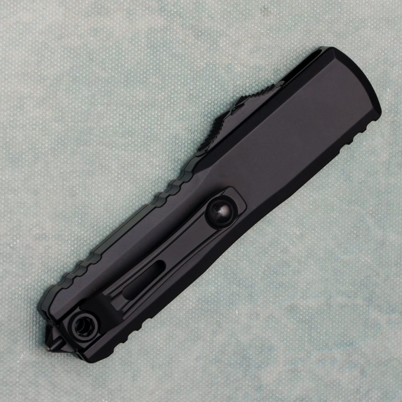 This new Gen IV model features the new drivetrain we've come to love along with the crud cutter. Black anodized 6061-T6 aluminum handle scales, the front scale has the Microtech Claw logo. Black finished M390MK stainless steel double edge dagger double full serrated blade. Black finished hardware, pocket clip, and glass breaker tip. These are not zero blade play models. Brand new in box.