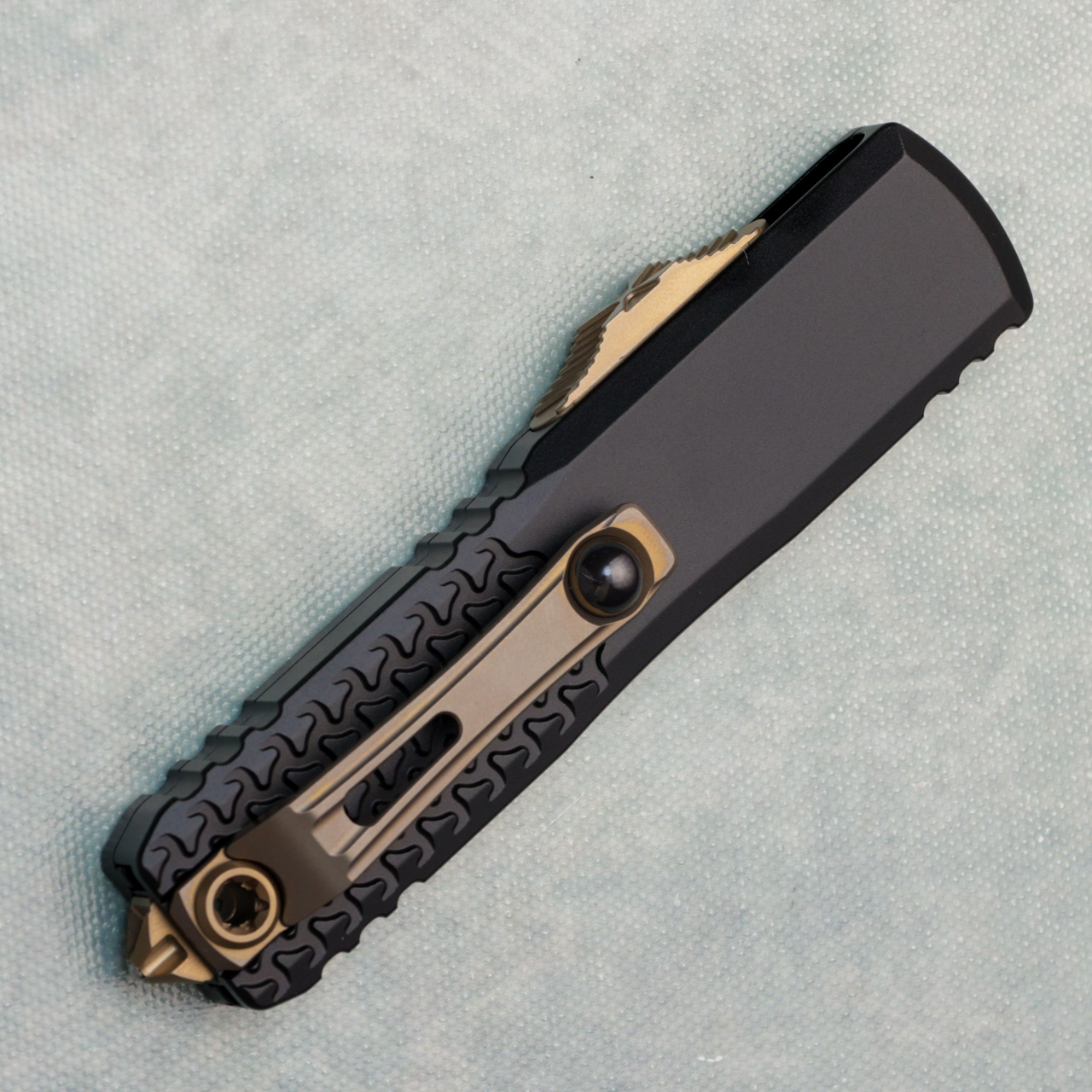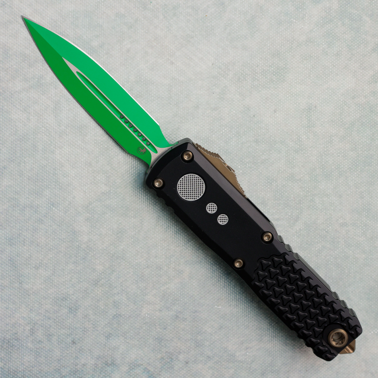 This new Gen IV model features the new drivetrain we've come to love along with the crud cutter. Jedi Master finished 6061-T6 aluminum handle scales. Green Cerakote finished M390MK stainless steel double edge dagger blade. Bronze finished hardware, pocket clip, and glass breaker tip. The blade has the Microtech logo. These are not zero blade play models. Brand new in box.