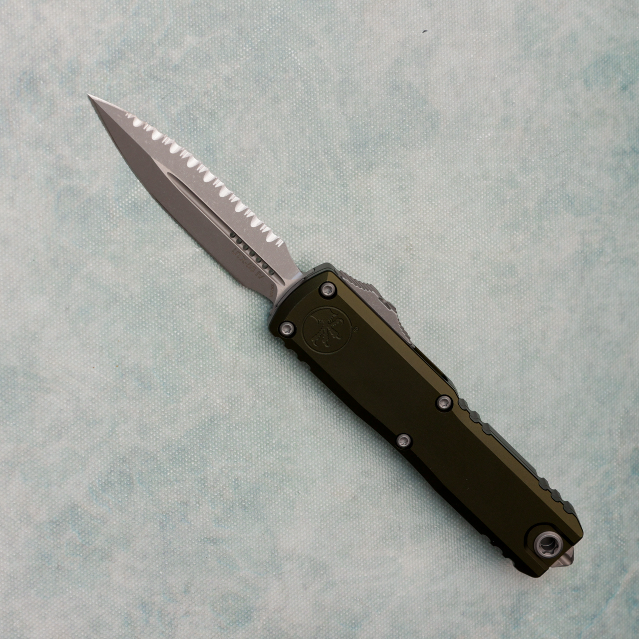 Microtech UTX-85 Gen IV D/E OD Green Handle Apocalyptic Full Serrated Blade 12324-12APOD