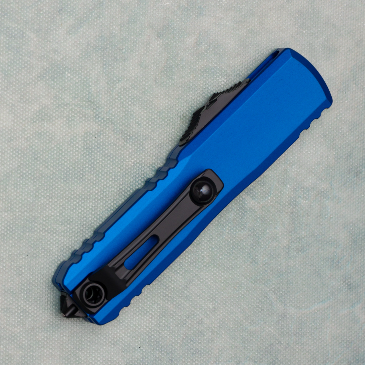 This new Gen IV model features the new drivetrain we've come to love along with the crud cutter. Blue anodized 6061-T6 aluminum handle scales, the front scale has the Microtech Claw logo. Two-tone black/satin finished M390 stainless steel single edge blade. Black finished hardware, pocket clip, and glass breaker tip. The blade has the Claw logo. These are not zero blade play models. Brand new in box.