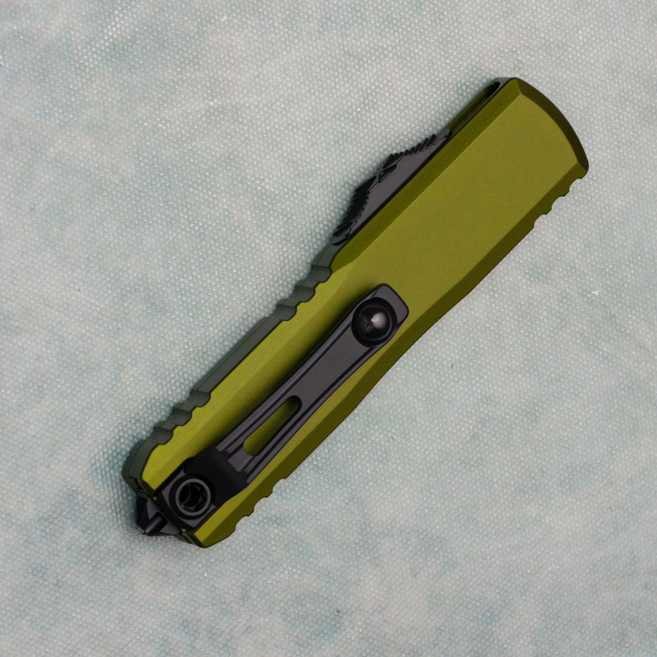 This new Gen IV model features the new drivetrain we've come to love along with the crud cutter. OD Green anodized 6061-T6 aluminum handle scales, the front scale has the Microtech Claw logo. Two-tone black/satin finished M390 stainless steel single edge blade. Black finished hardware, pocket clip, and glass breaker tip. The blade has the Claw logo. These are not zero blade play models. Brand new in box.