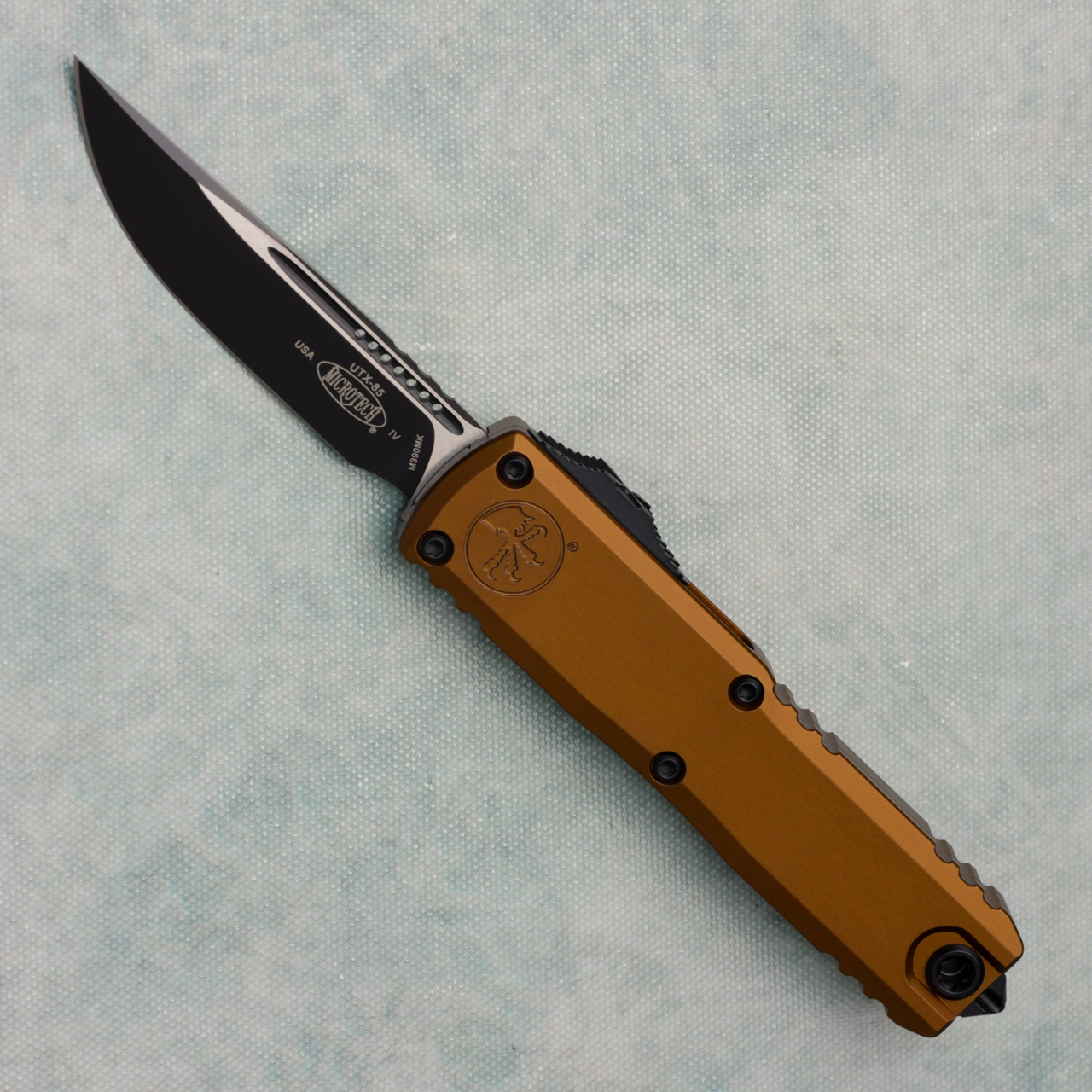This new Gen IV model features the new drivetrain we've come to love along with the crud cutter. Tan anodized 6061-T6 aluminum handle scales, the front scale has the Microtech Claw logo. Two-tone black/satin finished M390 stainless steel single edge blade. Black finished hardware, pocket clip, and glass breaker tip. The blade has the Claw logo. These are not zero blade play models. Brand new in box.