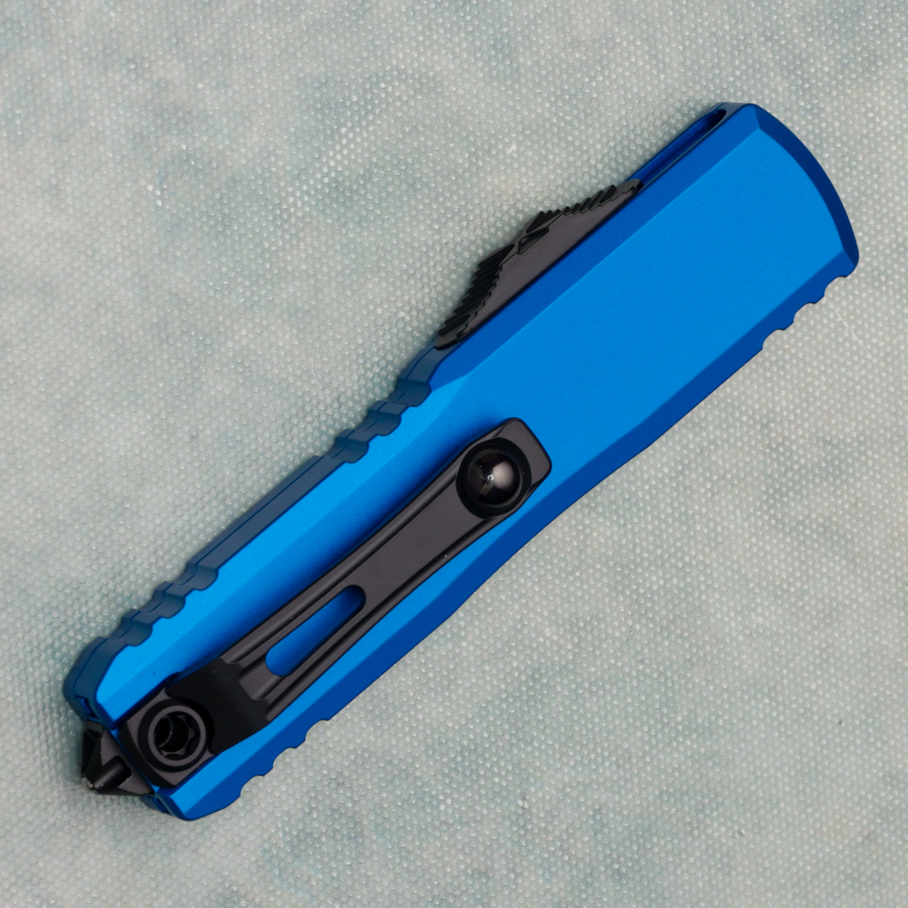 This new Gen IV model features the new drivetrain we've come to love along with the crud cutter. Blue anodized 6061-T6 aluminum handle scales, the front scale has the Microtech Claw logo. Two-tone black/satin finished M390 stainless steel tanto full serrated blade. Black finished hardware, pocket clip, and glass breaker tip. The blade has the Claw logo. These are not zero blade play models. Brand new in box.