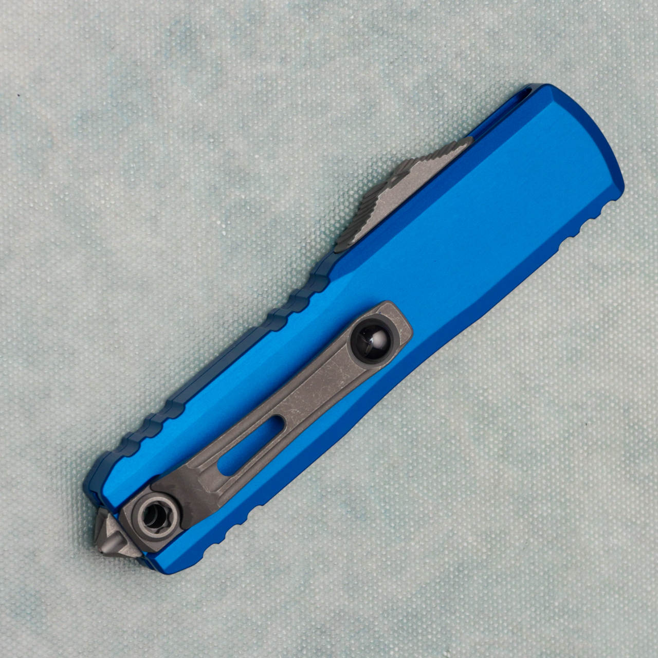 This new Gen IV model features the new drivetrain we've come to love along with the crud cutter. Blue anodized 6061-T6 aluminum handle scales, the front scale has the Microtech Claw logo. Apocalyptic finished M390 stainless steel part tanto edge blade. Apocalyptic finished hardware, pocket clip, and glass breaker tip. The blade has the Claw logo. These are not zero blade play models. Brand new in box.
