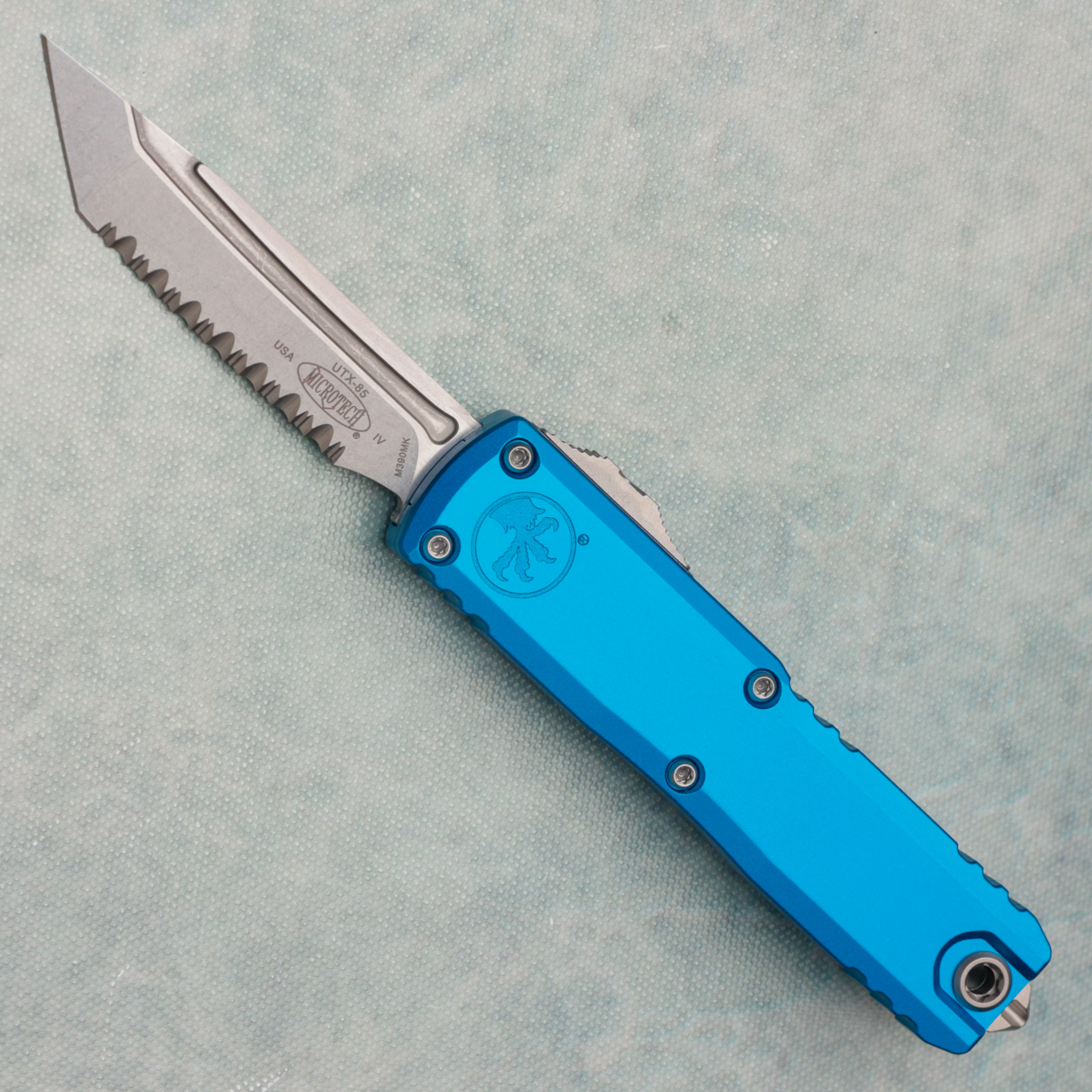 Microtech UTX-85 Gen IV T/E Blue Handle Stonewash Full Serrated Blade 12334-12BL