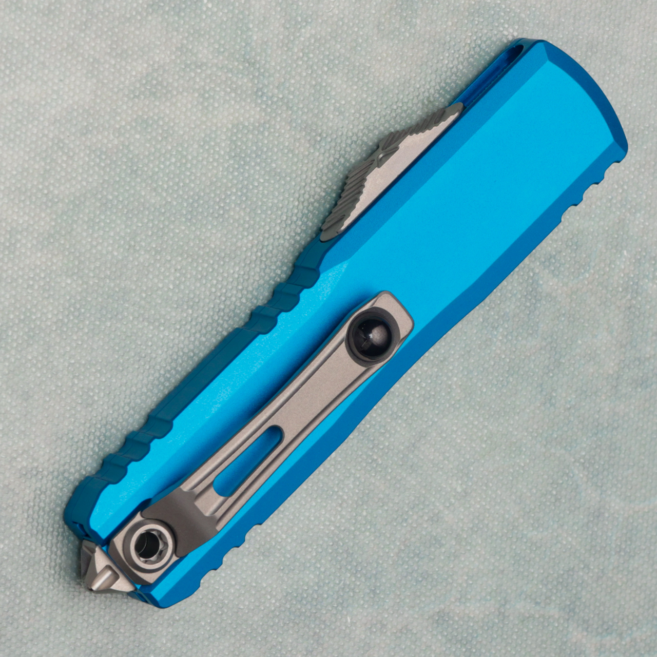 This new Gen IV model features the new drivetrain we've come to love along with the crud cutter. Blue anodized 6061-T6 aluminum handle scales, the front scale has the Microtech Claw logo. Stonewash finished M390 stainless steel tanto edge blade. Bead blast finished hardware, pocket clip, and glass breaker tip. The blade has the Claw logo. These are not zero blade play models. Brand new in box.