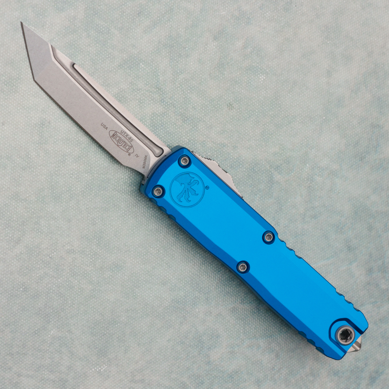 This new Gen IV model features the new drivetrain we've come to love along with the crud cutter. Blue anodized 6061-T6 aluminum handle scales, the front scale has the Microtech Claw logo. Stonewash finished M390 stainless steel tanto edge blade. Bead blast finished hardware, pocket clip, and glass breaker tip. The blade has the Claw logo. These are not zero blade play models. Brand new in box.