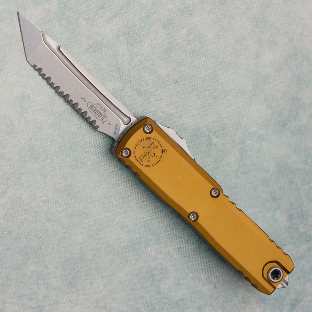 This new Gen IV model features the new drivetrain we've come to love along with the crud cutter. Tan anodized 6061-T6 aluminum handle scales, the front scale has the Microtech Claw logo. Stonewash finished M390 stainless steel tanto edge full serrated blade. Bead blast finished hardware, pocket clip, and glass breaker tip. The blade has the Claw logo. These are not zero blade play models. Brand new in box.
