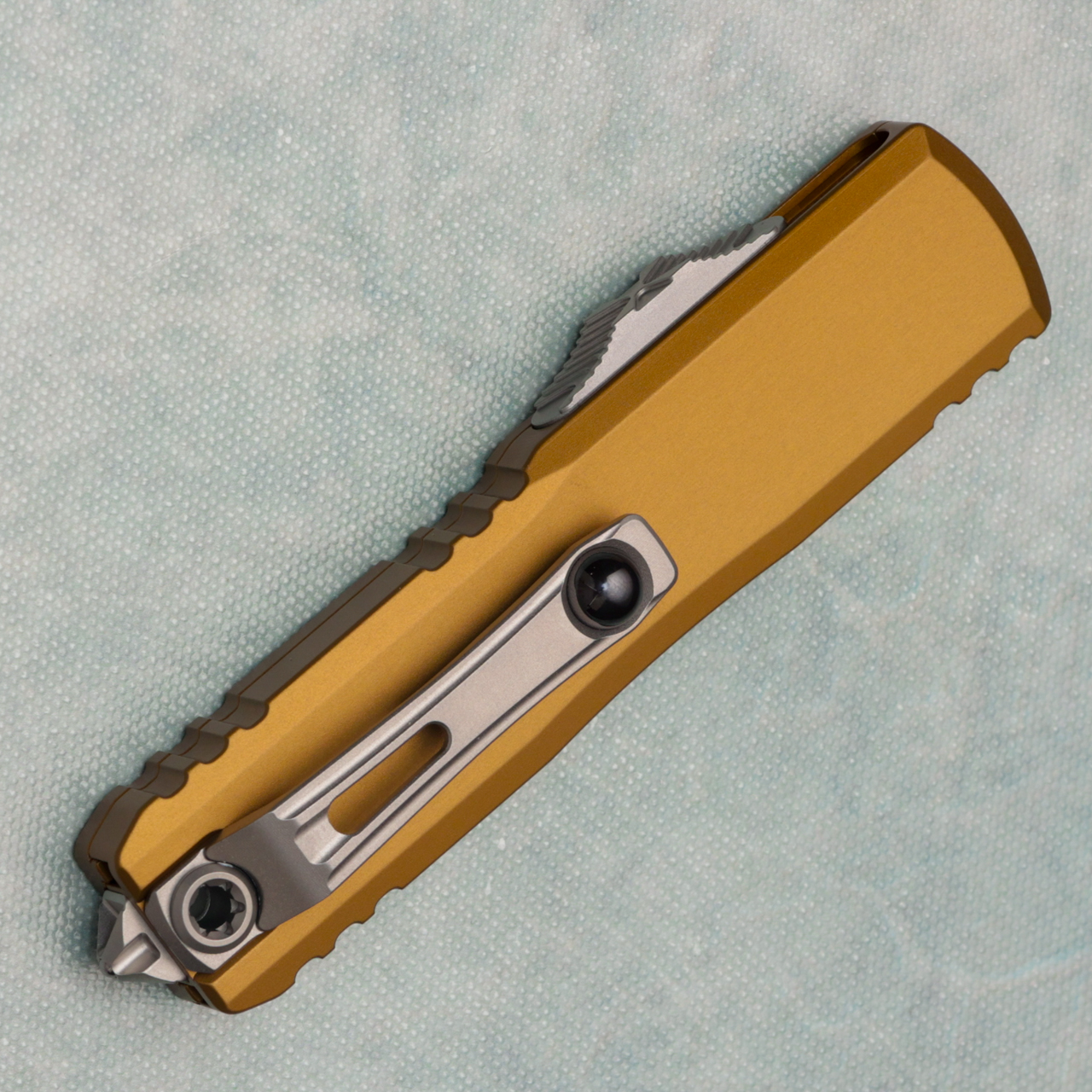This new Gen IV model features the new drivetrain we've come to love along with the crud cutter. Tan anodized 6061-T6 aluminum handle scales, the front scale has the Microtech Claw logo. Stonewash finished M390 stainless steel tanto edge blade. Bead blast finished hardware, pocket clip, and glass breaker tip. The blade has the Claw logo. These are not zero blade play models. Brand new in box.