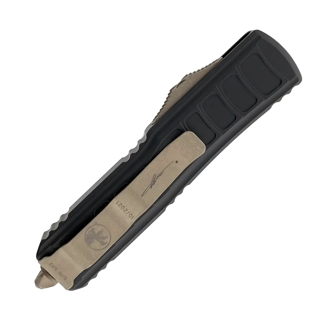 This Signature Series model features Black anodized 6061-T6 aluminum handle scales with chamfered edges and high traction milling. The handle also has jimping for secured hold. Bronzed Apocalyptic finished M390 stainless steel double edge blade with one standard cutting edge and one full serrated edge. Bronze Apocalyptic finished hardware, pocket clip, and glass breaker tip. The blade has the Microtech logo and model information. The pocket clip has the Microtech logo, Signature Series logo, serial number, and production date. Brand new in box.