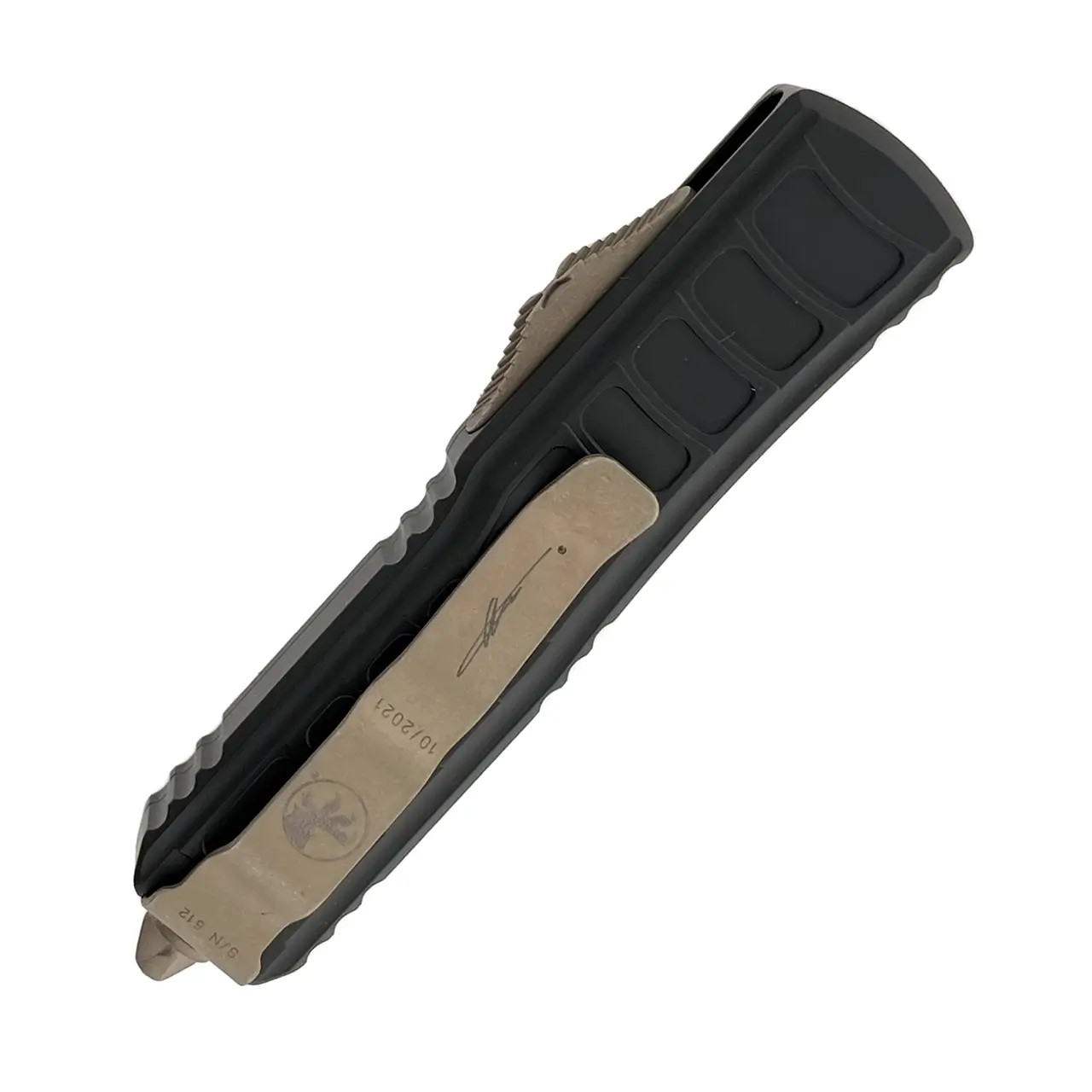 This Signature Series model features Black anodized 6061-T6 aluminum handle scales with chamfered edges and high traction milling. The handle also has jimping for secured hold. Bronzed Apocalyptic finished M390 stainless steel double edge blade with standard cutting edges. Bronze Apocalyptic finished hardware, pocket clip, and glass breaker tip. The blade has the Microtech logo and model information. The pocket clip has the Microtech logo, Signature Series logo, serial number, and production date. Brand new in box.
