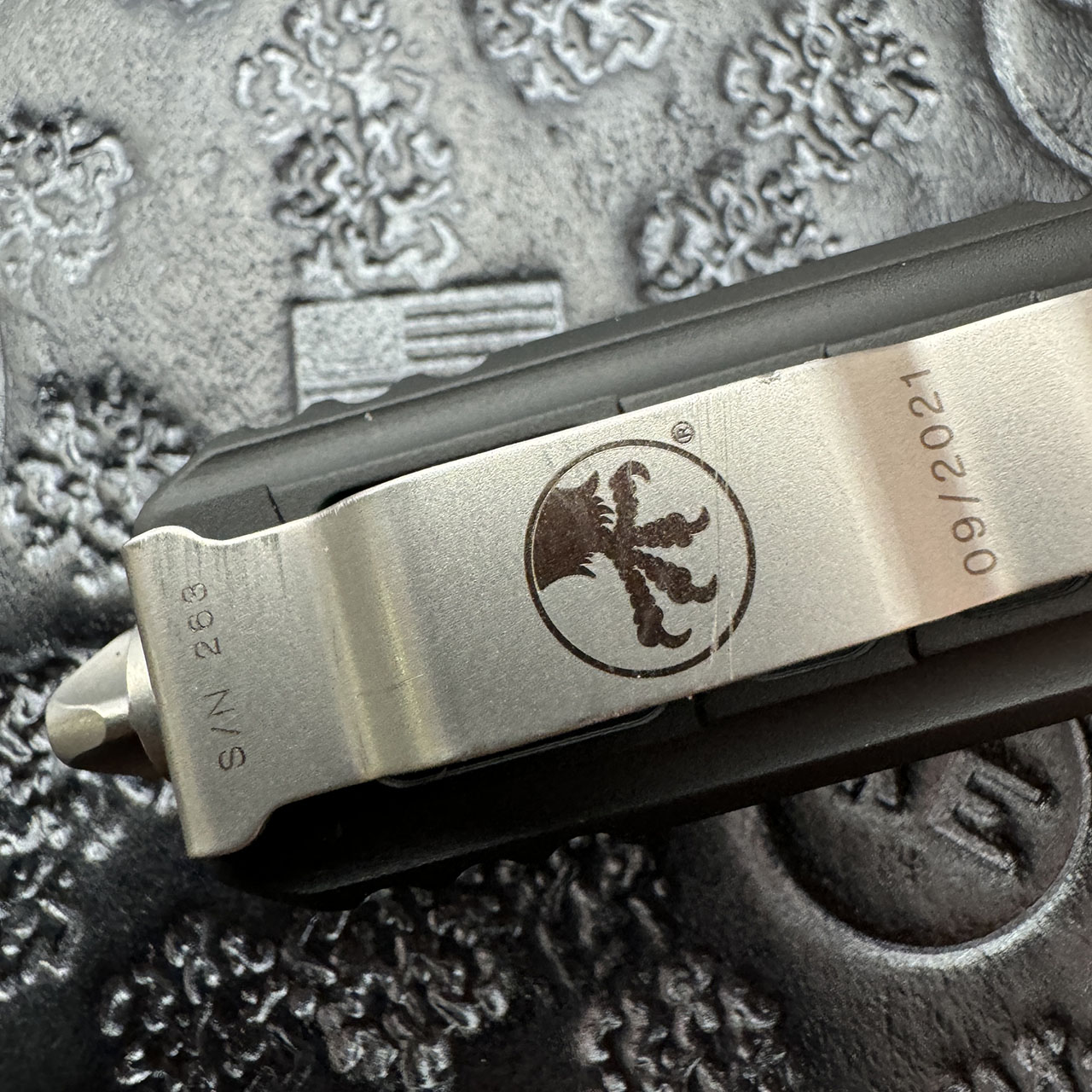 This Signature Series model features black anodized 6061-T6 aluminum handle scales with chamfered edges and high traction milling. The handle also has jimping for secured hold. Stonewash finished M390 stainless steel single drop point blade. Bead Blasted finished hardware, pocket clip, and glass breaker tip. The blade has the Microtech logo and model information. The pocket clip has the Microtech logo, Signature Series logo, serial number, and production date. Pre-owned condition with some scratches on clip being only major wear, in box.
