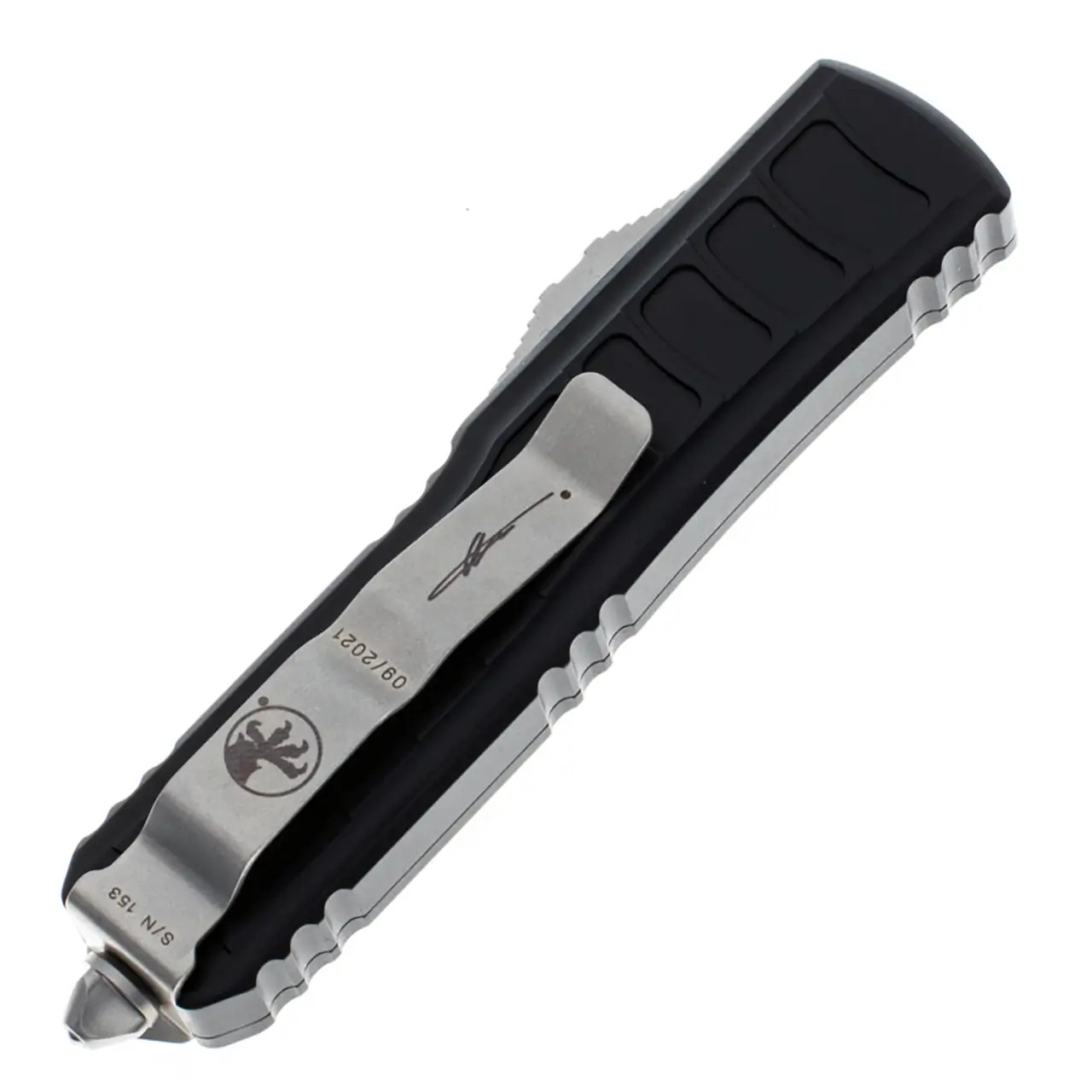 This Signature Series model features black anodized 6061-T6 aluminum handle scales with chamfered edges and high traction milling. The handle also has jimping for secured hold. Stonewash finished M390 stainless steel single drop point blade. Bead Blasted finished hardware, pocket clip, and glass breaker tip. The blade has the Microtech logo and model information. The pocket clip has the Microtech logo, Signature Series logo, serial number, and production date. Brand new in box.