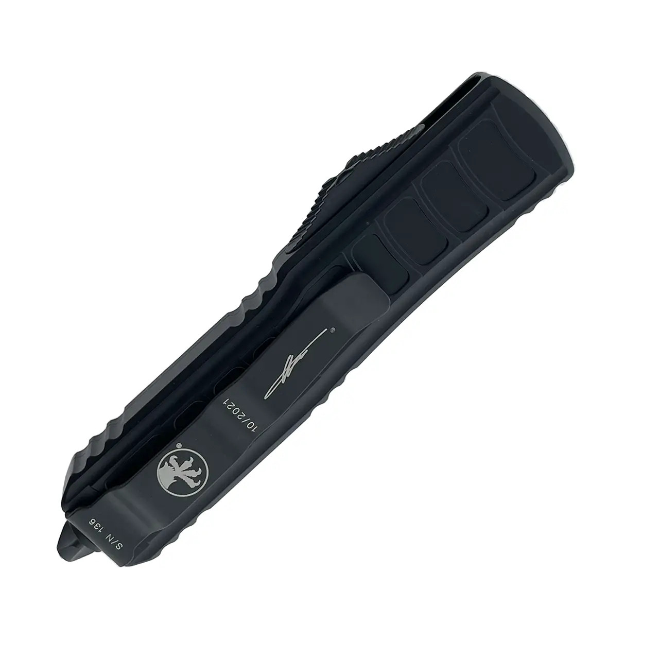 This Signature Series model features Black anodized 6061-T6 aluminum handle scales with chamfered edges and high traction milling. The handle also has jimping for secured hold. Black M390 or ELMAX* stainless steel tanto edge blade with standard cutting edges. Black Tactical finished hardware, pocket clip, and glass breaker tip. The blade has the Microtech logo and model information. The pocket clip has the Microtech logo, Signature Series logo, serial number, and production date. Brand new in box.