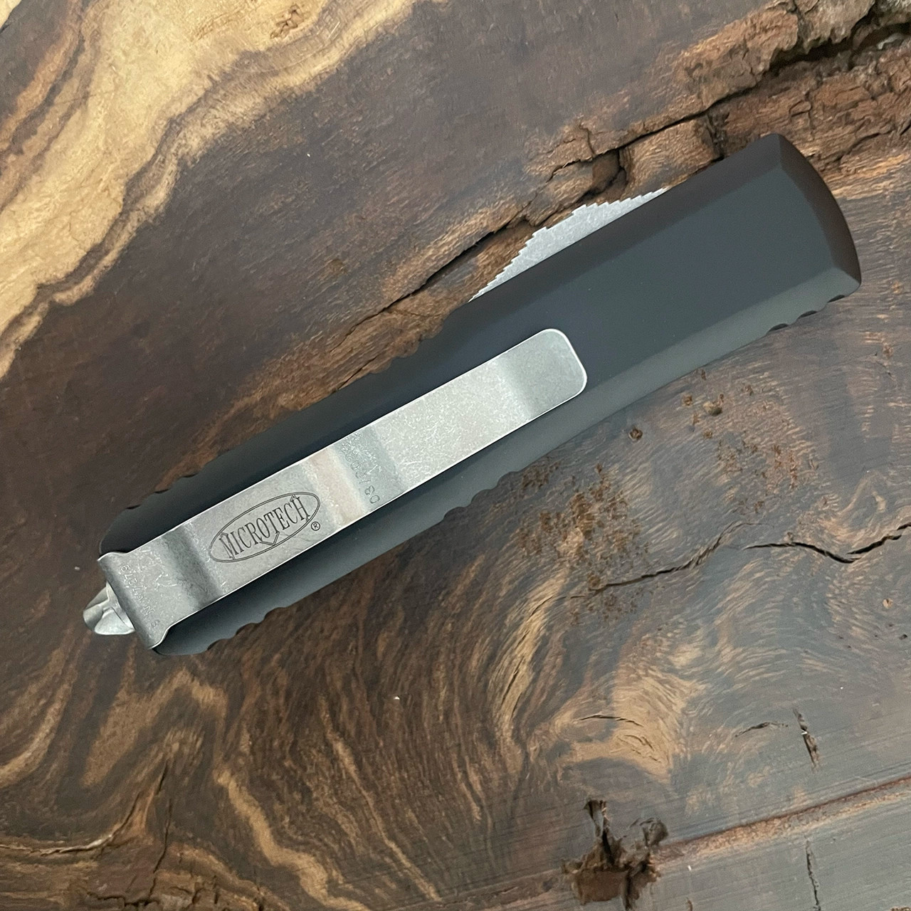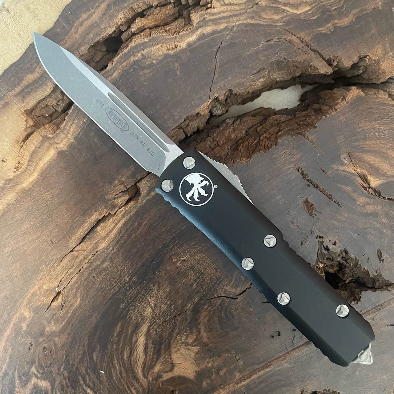 Microtech has updated and refined the UTX-85 model. It features improved ergonomics, with rounded handle faces, and patches of grooves along the sides to ensure excellent grip. The firing button has been redesigned to increase surface contact for effective engagement, and the glass breaker has a ball-tip set in the trip-angle pattern base to increase its everyday carry manners. Based on the Ultratech platform, the UTX-85 is scaled down to 85% of its length. The UTX-85 is an appealing option for those who prefer a smaller EDC knife and value Microtech's high-performance out-the-front action and exceptional build quality.