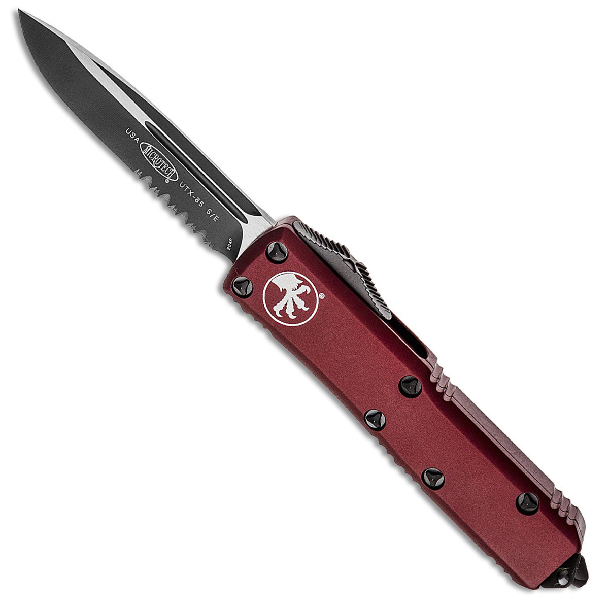 This model features an merlot red anodized 6061-T6 handle with the Microtech Claw logo on the front. Two tone black finished CTS-204P stainless steel single edge drop point blade with a partially serrated edge. Black tactical finished hardware, pocket clip, and glass breaker tip. The blade has the model information and Microtech logo. The pocket clip has the Microtech logo, serial number, and production date. Brand new in box.