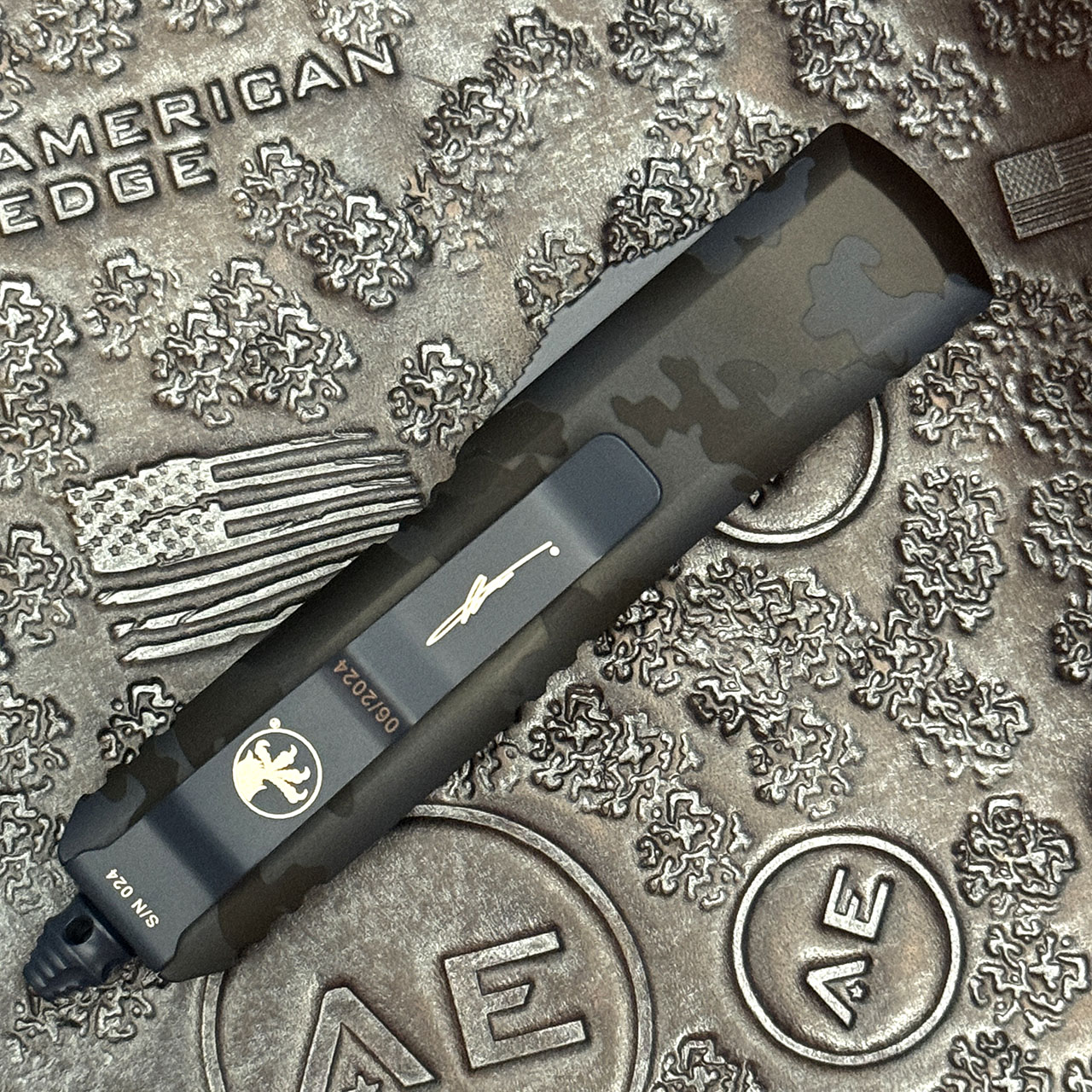 This model features navy camo Cerakote 6061-T6 aluminum handle scales, The front has the Microtech Claw logo. Navy Camo finished M390 stainless steel single drop point blade. Navy finished hardware, pocket clip, and glass breaker tip. The pocket clip has the Microtech logo, Signature Series logo, serial number, and production date. Brand new in box.