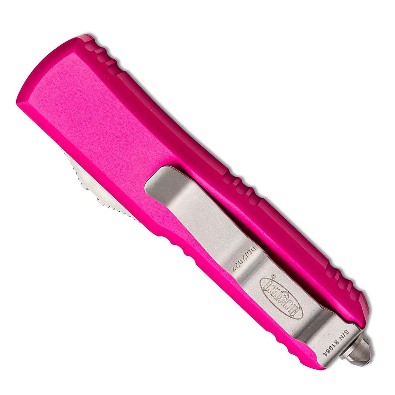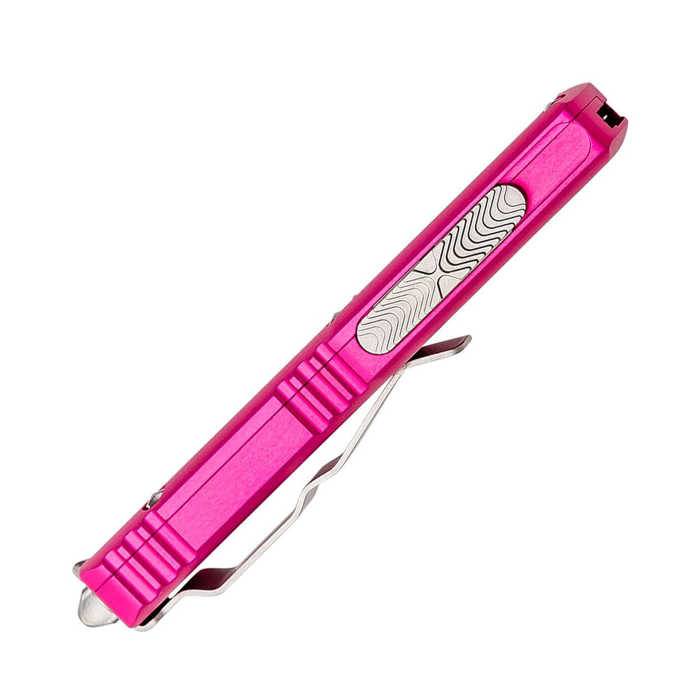 This model features pink anodized 6061-T6 aluminum handle scales, the front has the Microtech Claw logo. Stonewash finished M390 stainless steel single drop point blade. Bead blasted finished hardware, pocket clip, and glass breaker tip. The blade has the Microtech logo and model information. The pocket clip has the Microtech logo, serial number, and production date. Brand new in box.