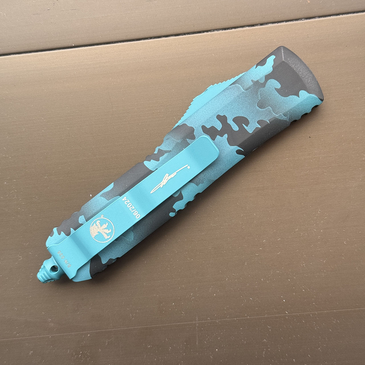 This model features turquoise camo Cerakote 6061-T6 aluminum handle scales, The front has the Microtech Claw logo. Turquoise Camo finished M390 stainless steel single drop point blade. Turquoise finished hardware, pocket clip, and glass breaker tip. . The pocket clip has the Microtech logo, Signature Series logo, serial number, and production date. Brand new in box.