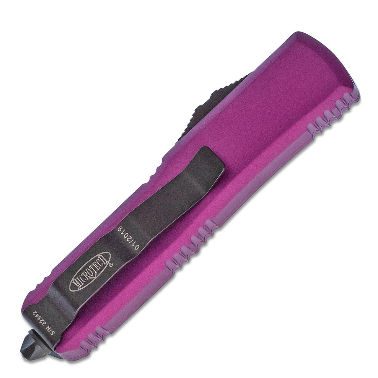 This model features violet anodized 6061-T6 aluminum handle scales, the front has the Microtech Claw logo. Black finished M390 stainless steel single drop point blade. Black finished hardware, pocket clip, and glass breaker tip. The blade has the Microtech logo and model information. The pocket clip has the Microtech logo, serial number, and production date. Brand new in box.