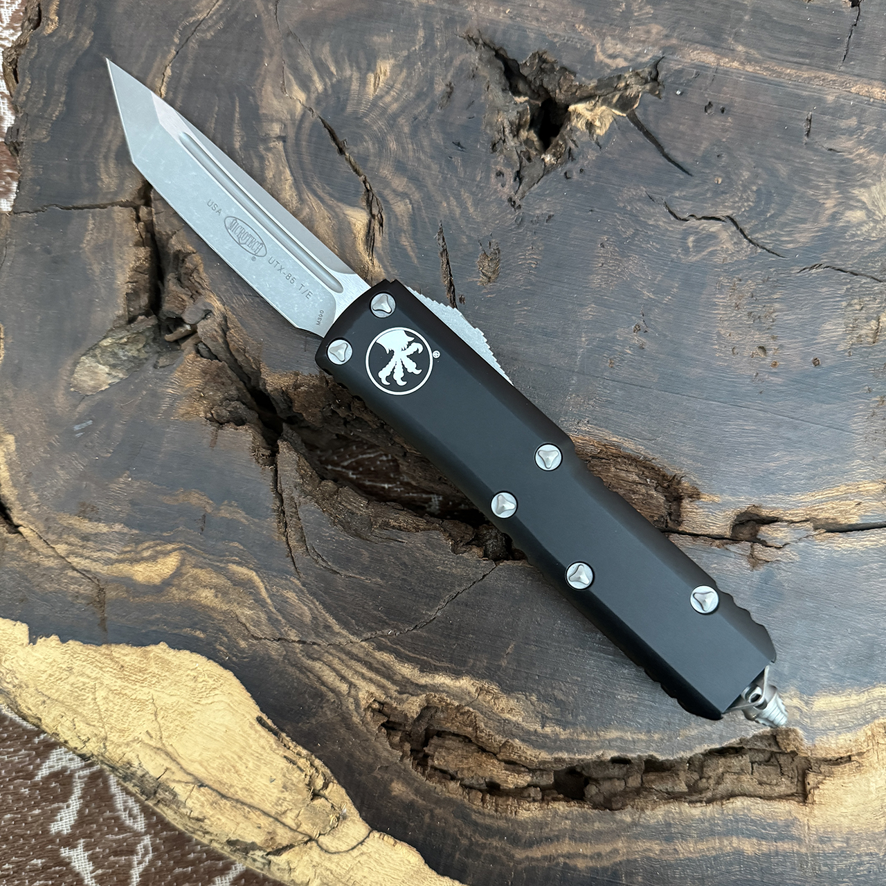 Microtech has updated and refined the UTX-85 model. It features improved ergonomics, with rounded handle faces, and patches of grooves along the sides to ensure excellent grip. The firing button has been redesigned to increase surface contact for effective engagement, and the glass breaker has a ball-tip set in the trip-angle pattern base to increase its everyday carry manners. Based on the Ultratech platform, the UTX-85 is scaled down to 85% of its length. The UTX-85 is an appealing option for those who prefer a smaller EDC knife and value Microtech's high-performance out-the-front action and exceptional build quality.