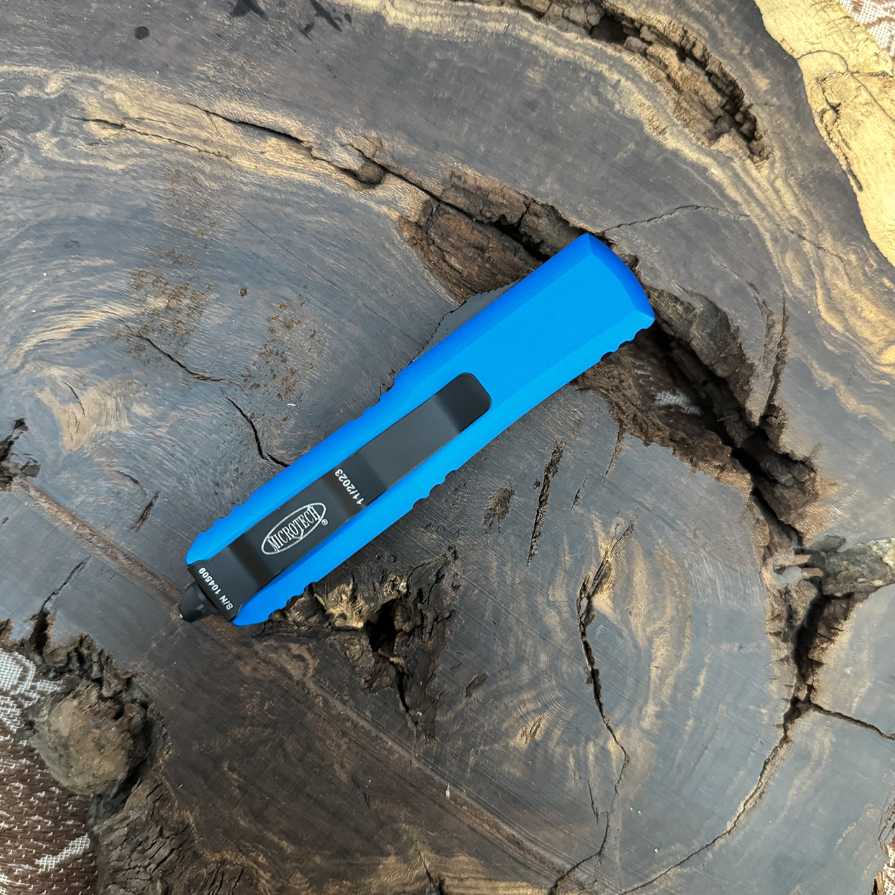 This model features blue anodized 6061-T6 aluminum handle scales, the front has the Microtech Claw logo. Black finished M390 stainless steel partially serrated tanto blade. Black finished hardware, pocket clip, and glass breaker tip. The blade has the Microtech logo and model information. The pocket clip has the Microtech logo, serial number, and production date. Brand new in box.