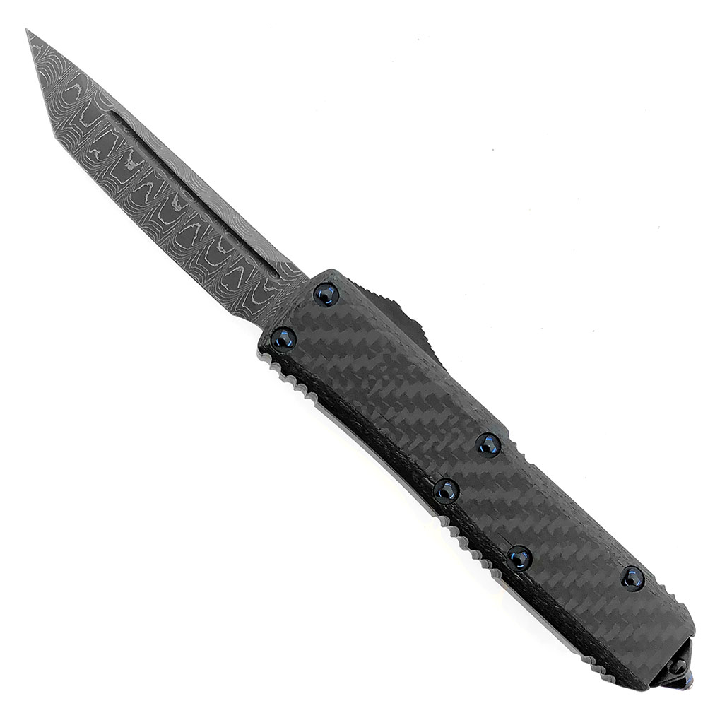 Microtech UTX-85 T/E Carbon Fiber Damascus Standard Blue Titanium Hardware 233-16CFTI