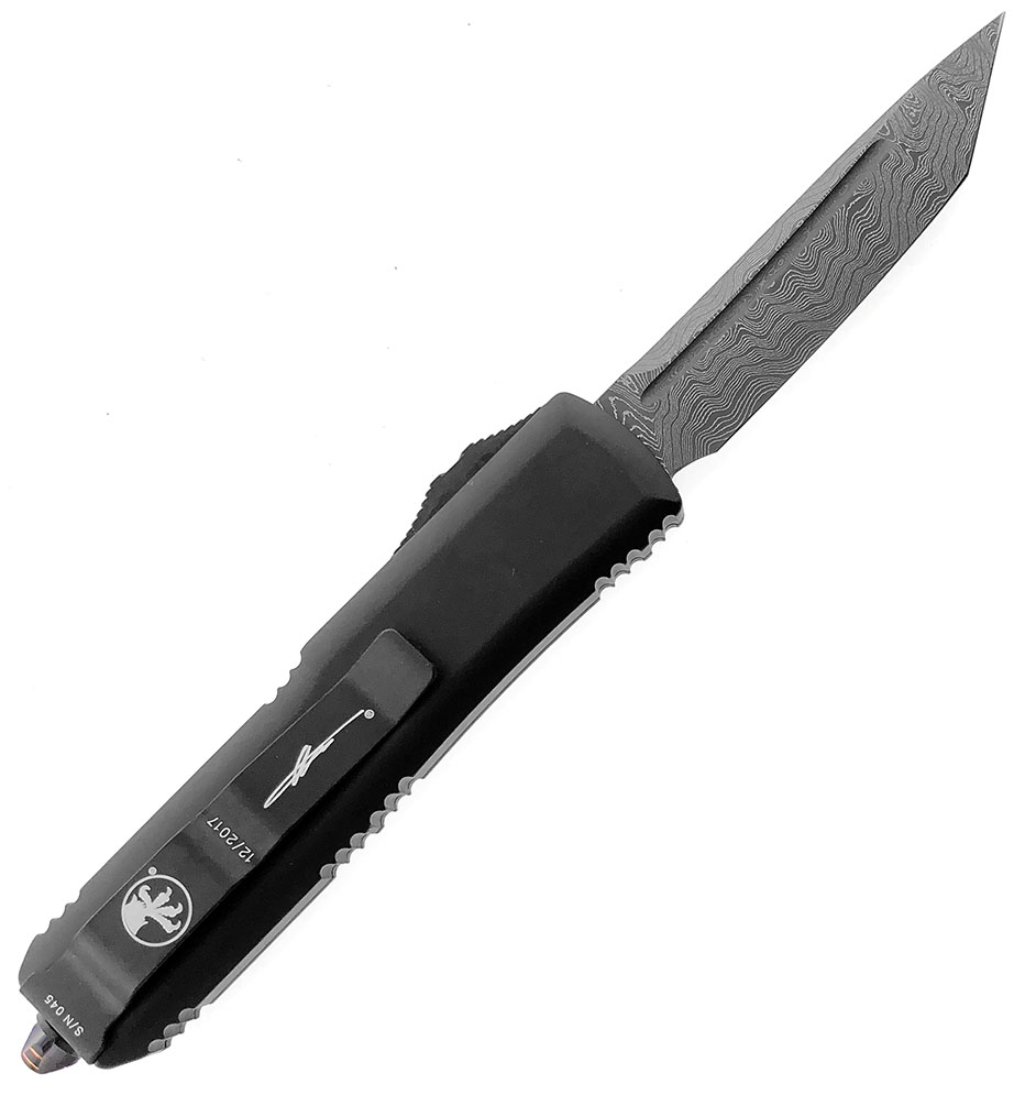 This custom limited edition signature series model has a Mike Norris Damascus blade with a standard cutting edge. Carbon Fiber front scale with a black anodized 6061-T6 aluminum rear scale. Copper ringed hardware, firing button, and glass breaker. Black pocket clip. The pocket features the Microtech Claw logo, the Signature Series logo, production date, and serial number. Serial Number #045. What a sweet UTX-85! Brand new in box.