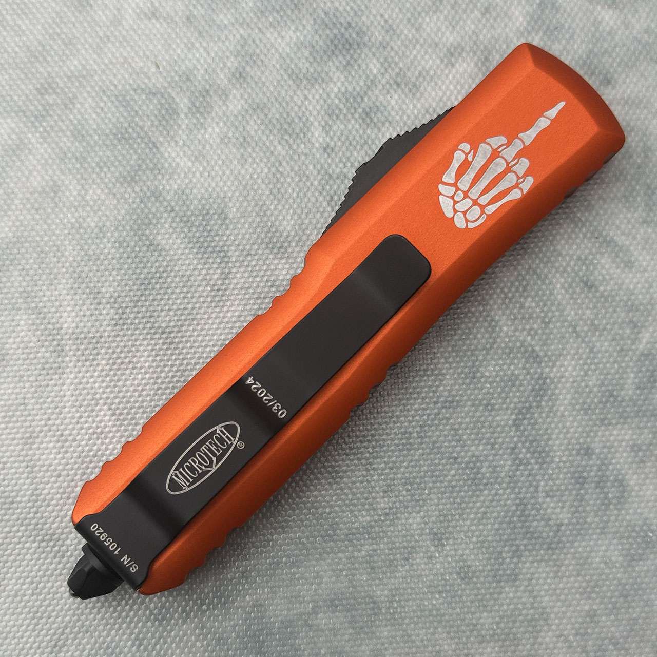 This AE Custom Shop model features Halloween themed engraved orange anodized 6061-T6 aluminum handle scales with the Microtech Claw logo on the front. Black finished M390 stainless steel tanto blade. Black tactical finished hardware, pocket clip, and glass breaker tip. The blade has the model information. The pocket clip has the Microtech logo, serial number, and production date. Brand new in box.