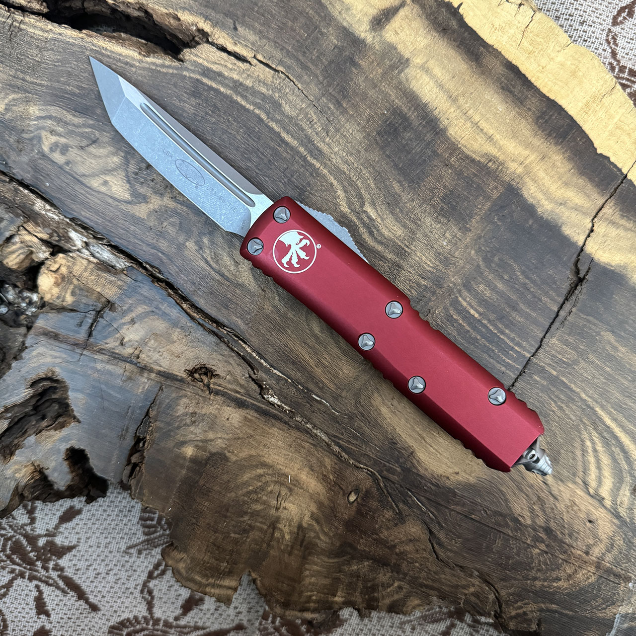 This model features merlot anodized aluminum handle scales with an apocalyptic finished M390 stainless steel tanto blade. Matching apocalyptic finished hardware, pocket clip, and glass breaker tip. The blade has the model information. The pocket clip has the Microtech logo, serial number, and production date. Brand new in box.